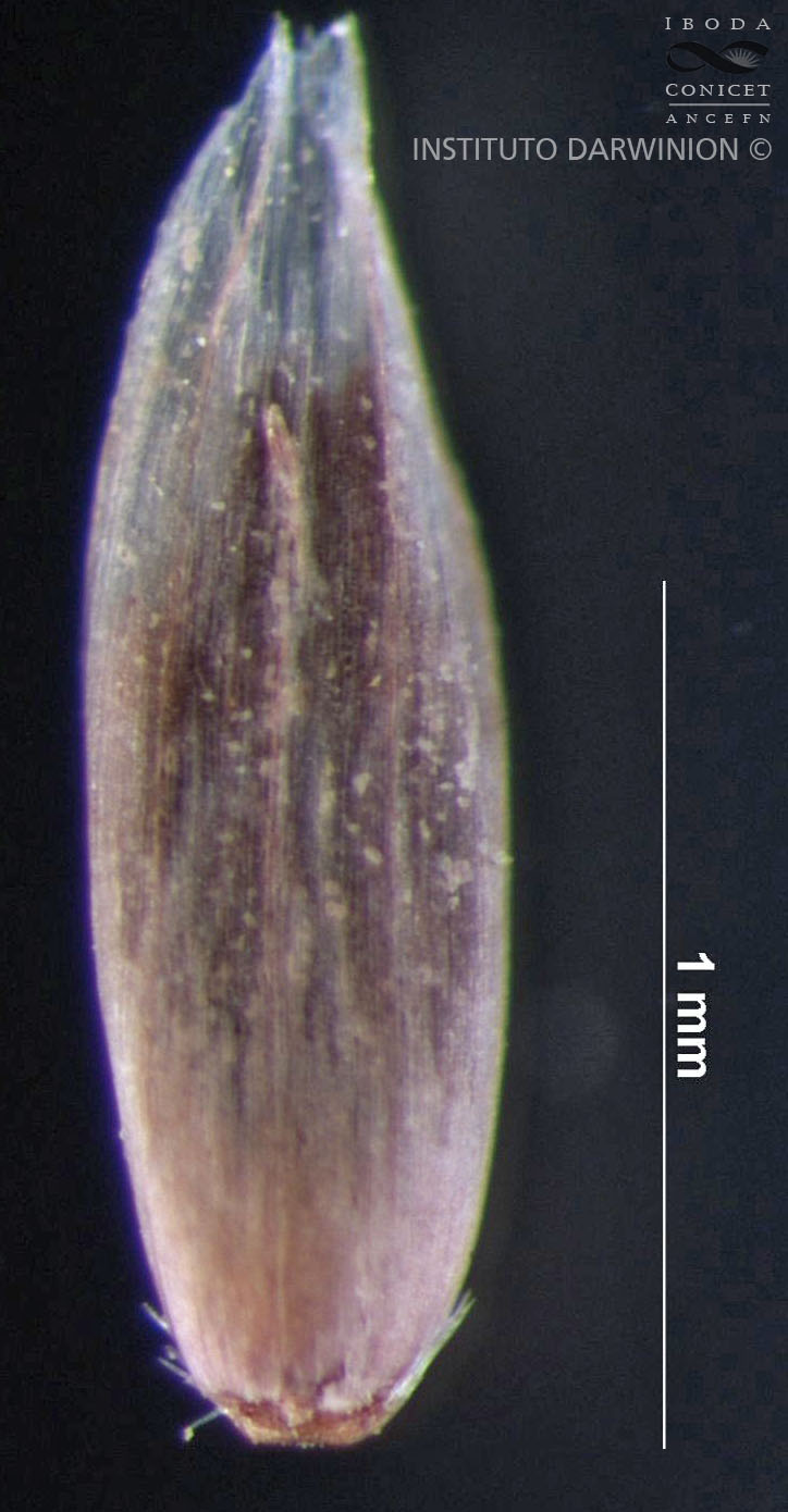 Hierbas perennes de (7-)30-65 cm de alto, rizomatosa, rizomas breves, verticales, delgados, áfilos o bracteados e incurvos; innovaciones intravaginales; cañas simples, erectas, geniculadas hasta el primer entrenudo; nudos 1-2; césped basal corto, denso, discolor, generalmente incurvo; cañas florífera y raquis glabros; vainas amarillentas, glabras, escabrosas hacia el ápice; lígulas de 3-8(-10) mm de largo, membranáceas, acuminadas, ápice agudo entero, eroso o lacerado, decurrentes con la vainas, dorso escabroso; láminas de 3-11 cm x 0,5-1 mm, verdosas, filiformes, convolutas o conduplicadas, rígidas, escabrosas, excepcionalmente glabras. Inflorescencia de (3-)8-15(-20) x (0,5-)1,7-5,5 cm, violáceo oscuro, laxa a veces contraída, exerta, ramificaciones laterales verticiladas, escabriúsculas, desnudas hasta su parte media; pedicelos de las espiguillas de 0,9-3,5 mm de largo, escabriúsculos. Espiguillas de 2,7-3(-3,5) mm de largo, violáceo oscuro; glumas 2, iguales o subiguales, 1-nervias, carinadas, carina escabrosa en la mitad superior, excepcionalmente glabra en la gluma superior, ápice agudo, múticas; callo breve, glabrescente, con 2 mechoncitos de pelos muy cortos y escasos hasta de 0,3 mm de largo; lemma de 1,6-2,5 mm de largo, membranácea, hialina, glabra, ápice truncado, denticulado, 5-nervia, nervios evidentes, escabriúsculos en el tercio superior, mútica o mucronada; pálea de 0,2 mm de largo, escuamiforme, muy difícil de observar; lodículas 2, de 0,2-0,4 mm de largo, lineares, hialinas; anteras de 1-2 mm de largo; cariopsis de 1,5-1,6 mm de largo, ovoide o elíptica, surco ventral profundo, mácula embrional pequeña; hilo notable, angostamente elíptico, endosperma seco, farináceo.