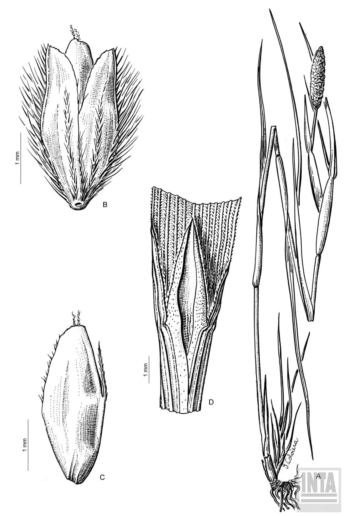 Plantas anuales o bienales, de 8-35 cm de alto, cañas geniculadas o rectas en la base, nudos 2-5, con 1 a 3 inflorescencias por caña; vainas lisas, glabras, las superiores dilatadas, las basales generalmente violáceas; lígulas de 2-4 mm de largo, de margen obtuso; láminas planas, de 2-10 cm x 2-4 mm, escabrosas en el margen y en los nervios. Inflorescencia una panoja cilíndrica, densa, de 2-10 cm de largo, frecuentemente con tintes violáceos; pedicelos muy cortos. Espiguillas de 2-2,8 mm de largo; glumas obtusas, con los márgenes soldados cerca de la base, con la quilla ciliada en toda su longitud; lemma con los márgenes soldados hasta la mitad, los nervios laterales bien marcados, de ápice obtuso, con una arista de 0,5-2 mm de largo inserta en la mitad o en el tercio superior y sobresaliendo 0,5-1 mm de las glumas; anteras de 1-1,3 mm de largo, de color anaranjado brillante o amarillo oro; cariopsis de 1,3-2 mm de largo, comprimida dorsalmente.