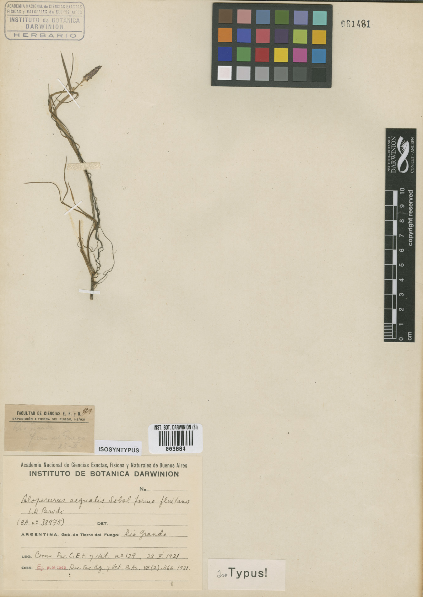 Alopecurus aequalis Sobol. f. fluitans Parodi f. fluitans Sobol. Revista Fac. Agron. Veterin. 7(2): 366. 1931 TIPOS. Argentina. Tierra del Fuego: Río Grande, M. Doello Jurado 129 (sintipo BA; isosintipo SI!), 131 ½ (sintipo BA; isosintipo SI!).