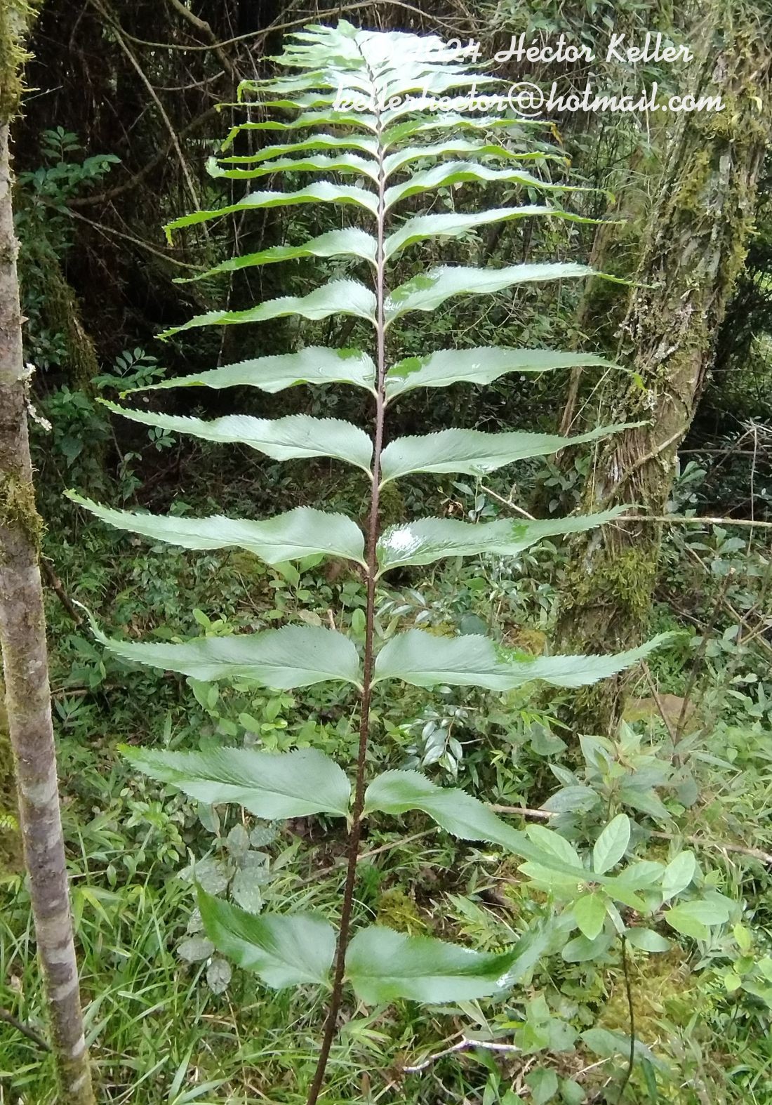 Plantas terrestres, ocasionalmente epífitas o rupículas. Rizomas largamente rastreros, cubiertos densamente con escamas linearsubuladas, con ápices piliformes. Frondes dísticas, erectas, 3-7 por rizoma, hasta de 1 m de largo o más; pecíolos robustos, de 17- 55 cm de largo, castaño-oscuros, con escamas semejantes a las del rizoma en la parte basal; láminas pinnadas, de 19-40 × 10-22 cm, algo reducidas en la base y hacia el ápice, papiráceas a coriáceas; raquis semejantes al pecíolo, surcados dorsalmente, con escasas escamas en la axila de las pinnas; pinnas numerosas, 7-15 pares, rectas a ascendentes, elípticas a elíptico-lanceoladas, de 5-15 × 1,2-2 cm, largamente acuminadas, con bases cuneadoredondeadas, con el lado acroscópico un poco más desarrollado, márgenes aserrados o biserrados. Soros muy próximos a la costa, en ángulo agudo a casi paralelos a la misma, de 0,5-1 cm de largo; indusios oscuros, membranáceos, de margen entero. Esporas de 41,2-48 × 38,7-49,4 µm, con perisporio alado-equinulado, reticulado, con pliegues escasos parcialmente fusionados.