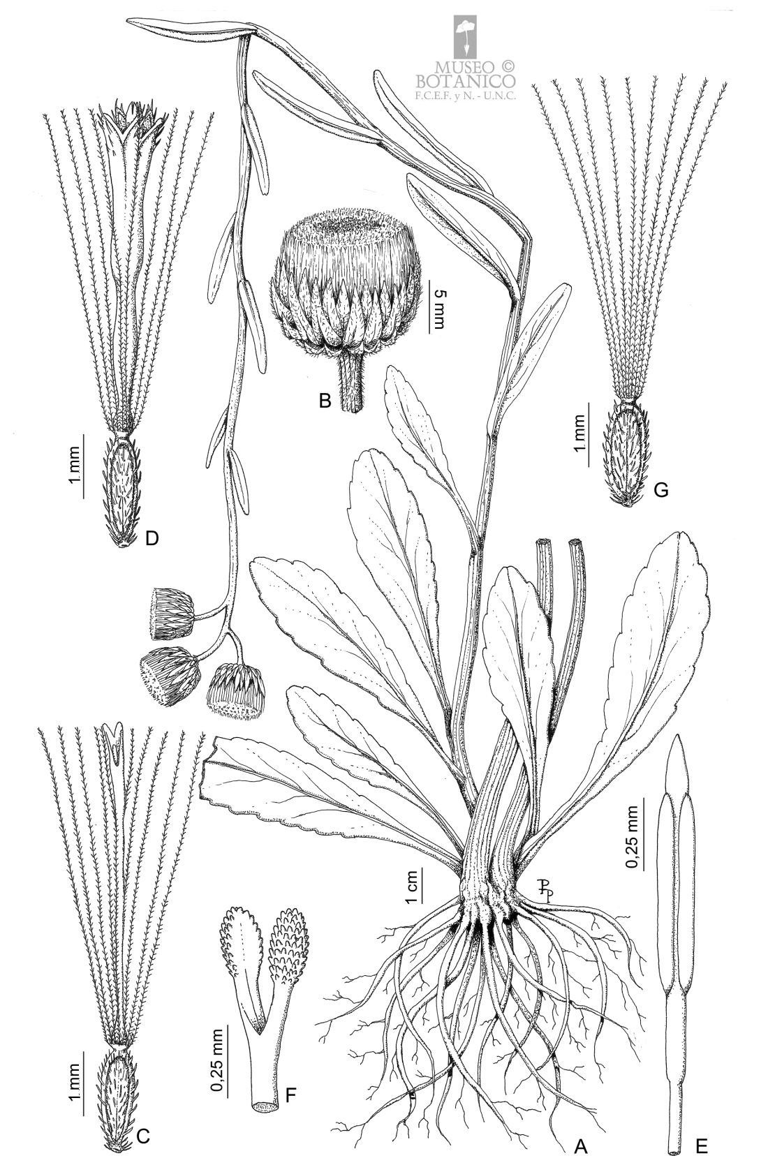 A. Planta. B. Capítulo. C. Flor del margen. D. Flor del centro. E. Estambre. F. Estilo (sección). G. Aquenio con papus.