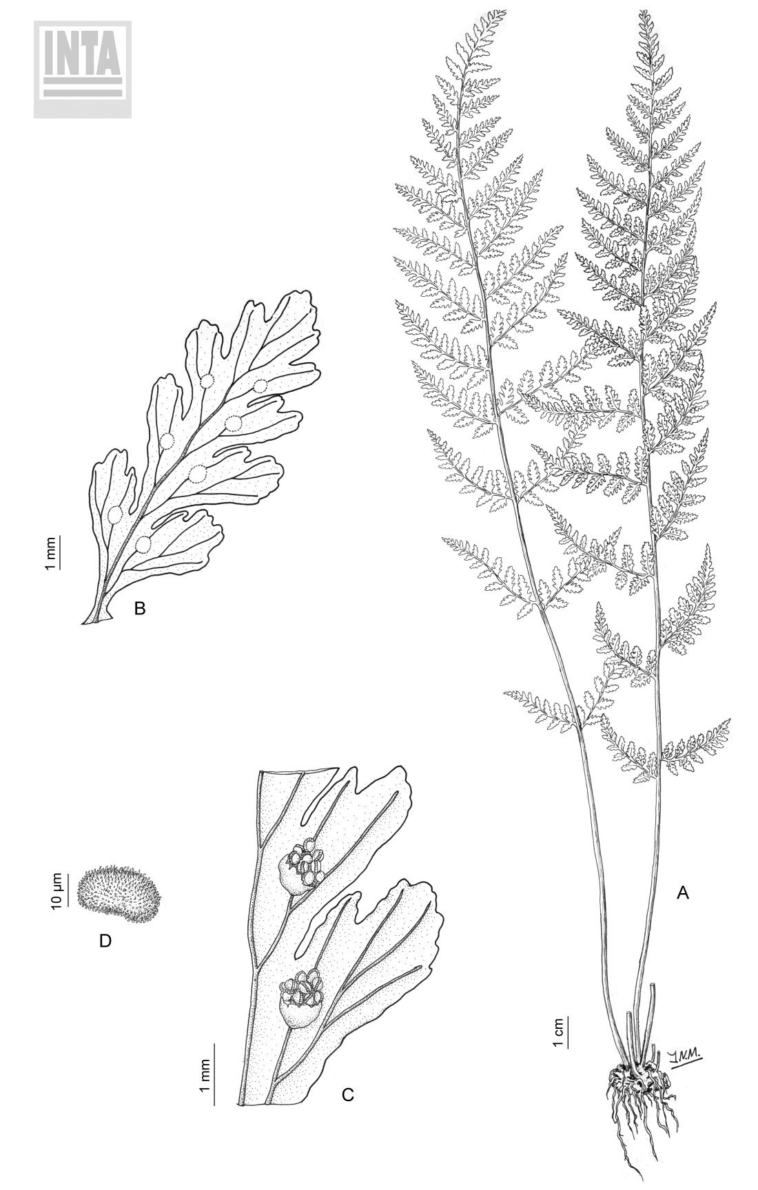 A. Planta. B. Pinna. C. Detalle de los segmentos foliares. D. Espora.