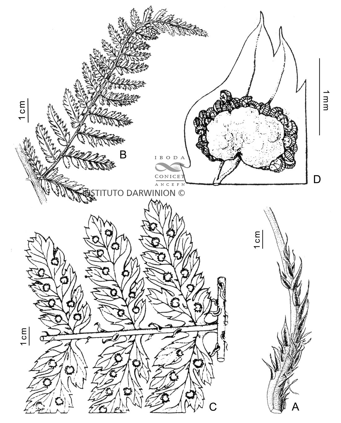 Plantas terrestres; rizomas erectos o ascendentes, escamosos. Frondes de 10-50(-150) cm de largo; pecíolos 1/4 de la longitud total de la fronde, delgados, castaño amarillentos en la mayor parte de su longitud, densamente escamosos en la base; escamas lanceoladas a ovado-lanceoladas, castaño oscuras o negruzcas en el centro y castaño claras en el margen; láminas de contorno triangular-ovado o triangularlanceolado, 3-pinnadas, eglandulares, verde oscuras; pinnas triangular-ovadas o lanceoladas, pinnadas, pecioladas, imbricadas; pínnulas oblongo-ovadas o lanceoladas, ápice redondeado a obtuso, márgenes paralelos dispuestos oblicuamente a la costa, dentados, con dientes agudos. Soros de 0,5-1 mm de diámetro, en 2 hileras en cada segmento; indusios blanquecinos. Esporas crestado-espinulosas.