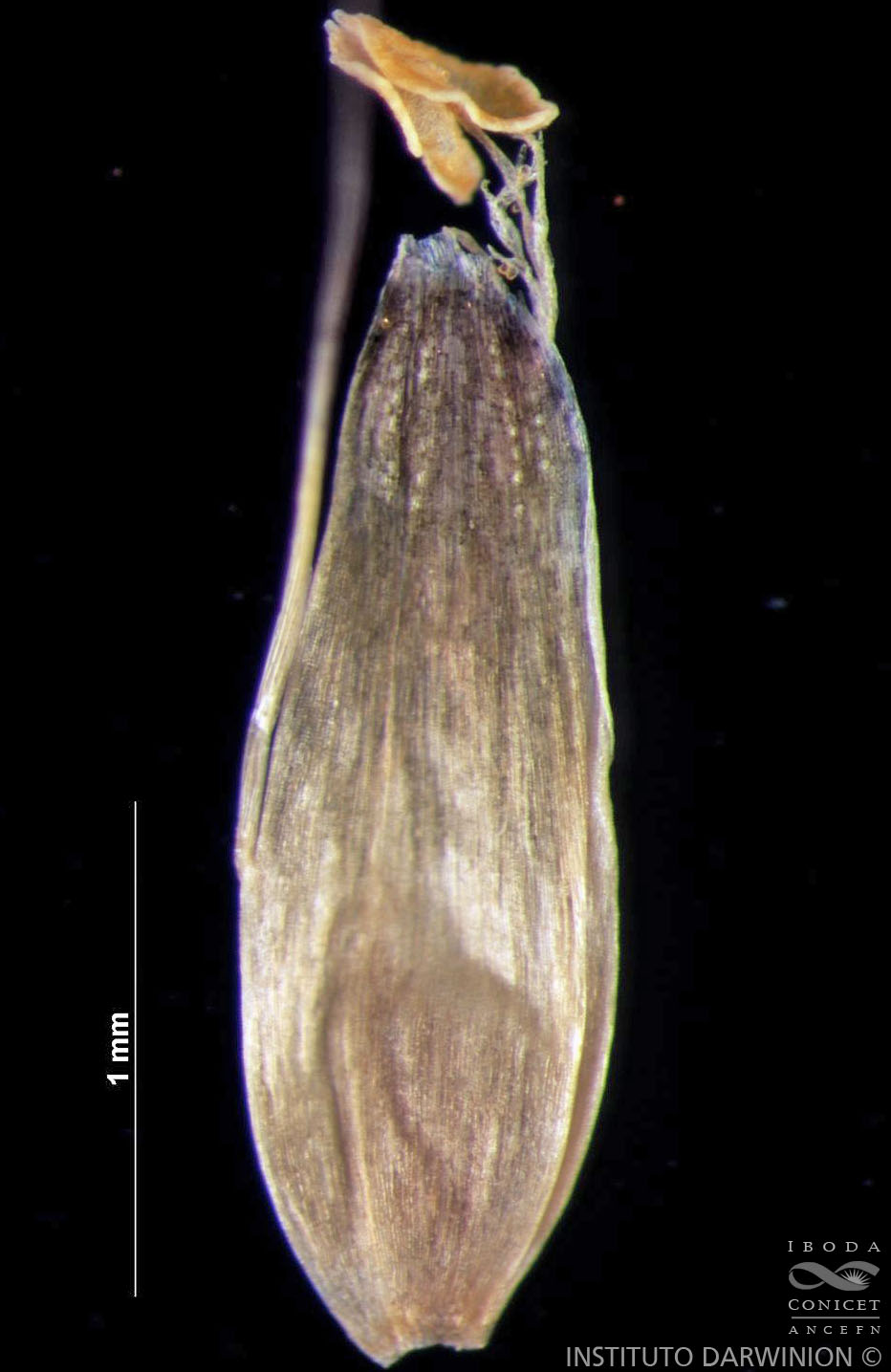 Plantas probablemente anuales, de 5-25 cm de alto, con 5-30 cañas floríferas, cada una 2-4 nudos, frecuentemente geniculadas en la base; vainas glabras, las superiores dilatadas, de menor longitud que los entrenudos; lígulas de 2,5-4 mm de largo, de ápice obtuso; láminas de 4-6 cm x 1-2 mm, planas, acuminadas. Inflorescencia una panoja cilíndrica, densa, de 1,5-3 cm de largo, verdosa o violácea, exerta de la última vaina o parcialmente incluida en ella; pedicelos claviformes, con frecuencia escabrosos. Espiguillas de 2,5-3 mm de largo; glumas con los bordes soldados en el tercio inferior, 3-nervias, con el ápice obtuso, ciliadas en toda la quilla, nervios laterales y bordes, con tintes verdosos o violáceos; lemma con los márgenes soldados hasta la mitad o un poco más hacia la parte superior, con el ápice obtuso y violáceo, glabra, con arista dorsal geniculada, de 2,7-3,5 mm de largo, inserta en la mitad de la lemma y exerta 1,5-2 mm del ápice de las glumas; anteras de 0,5-0,7 mm de largo.