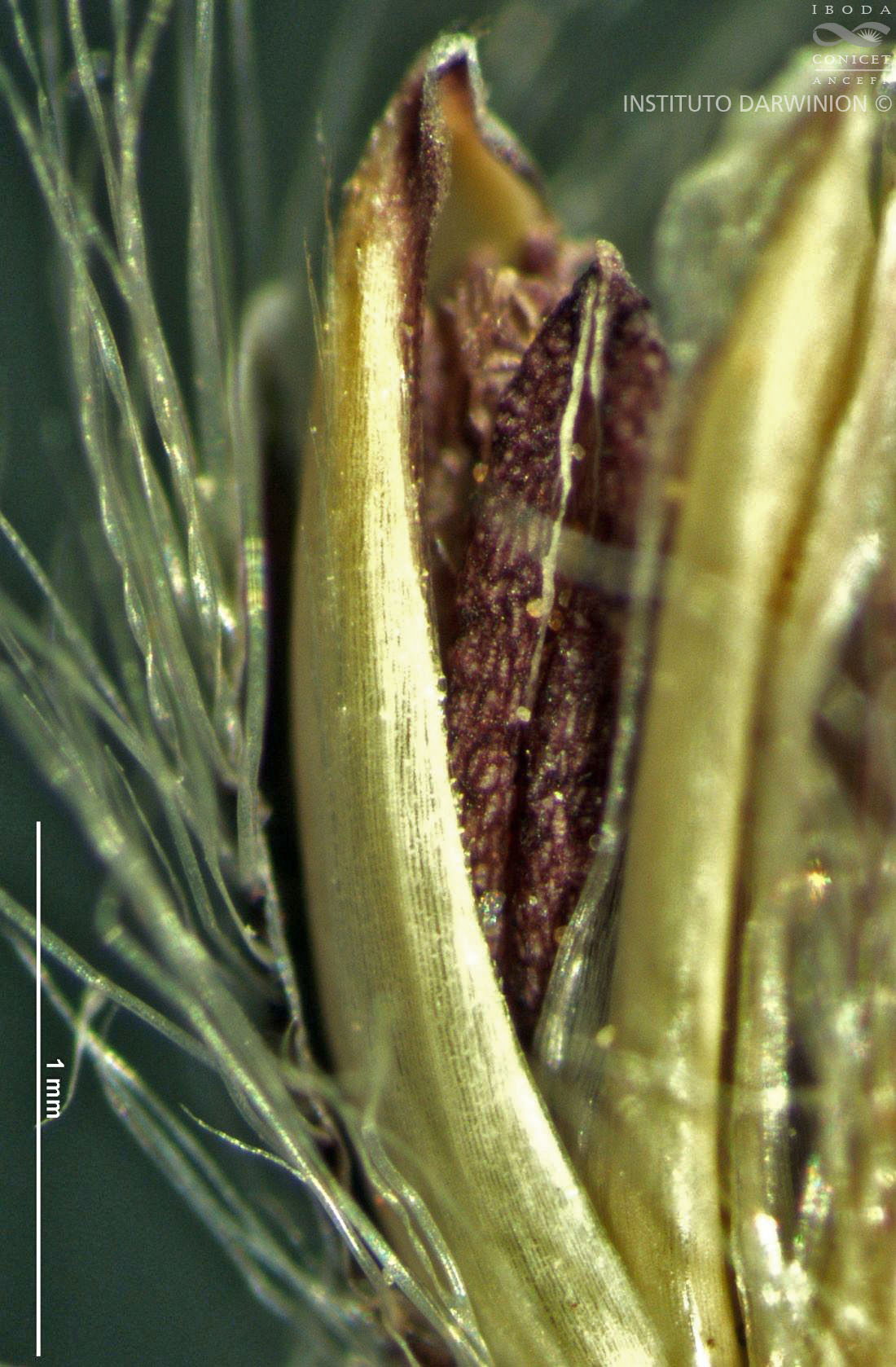 Plantas perennes, cespitosas, cortamente rizomatosas; cañas erectas, de (65-)80-150 cm de alto, paucinodes, con hojas fasciculadas en la base, luego distantes; entrenudos cortos hacia la base, luego elongados, hasta de 30 cm de largo, glabros, comprimidos, huecos; nudos glabros, castaños; vainas de 12-27 cm de largo, pilosas hacia la porción superior, luego glabras, con los márgenes membranáceos, glabros o un margen ciliado; lígulas de 0,3-1,2 mm de largo, membranáceas, glabras; láminas linear-lanceoladas, de 9-45 cm x 5-10 mm, de base atenuada y ápice agudo, superficie adaxial glabra o esparcidamente pilosa, con largos pelos por detrás de la región ligular, superficie abaxial glabra, márgenes escabrosos, involutos. Inflorescencias espiciformes, de (9-)15-27 x ca. 1 cm; pedúnculo de 20-60 cm de largo, terete, glabro; eje principal hirsuto, terete; ramificaciones de primer orden alternas a opuestas, adpresas, de 1-6,5 cm de largo en la base de la inflorescencia, reducidas hacia el ápice, las inferiores a 2-12 cm de distancia, luego aproximadas; raquis de las ramificaciones triquetro, hirsuto, plano sobre una de las caras; espiguillas en pares o en tríadas; pedicelos breves, claviformes, hirsutos. Espiguillas largamente elipsoides, de 3-3,6 x 1,2 mm, pálidas o con tintes purpúreos, densamente papiloso-pilosas; gluma inferior ovada, de 0,3-1 mm de largo, cubierta con largos pelos blanquecinos, enervia; gluma superior obtusa a aguda, de 2,6-2,8 mm de largo, más corta que el antecio superior, 5-7 nervia, con largos pelos tuberculados; lemma inferior glumiforme, de 2,8-3,3 mm de largo, 5-7 nervia; pálea inferior elíptica, de 3-3,3 mm de largo, hialina, glabra; flor inferior estaminada; lodículas 2, conduplicadas; anteras 3, estambres de 2,4 mm de largo; antecio superior elipsoide, de 2,9-3,3 mm de largo, 1 mm de ancho, liso, estramíneo, lustroso, cortamente piloso y papiloso junto al ápice; lemma superior con los márgenes membranáceos; lodículas 2, de 0,3 mm de largo; estambres 3, anteras de 2,3 mm long; cariopsis no vista.