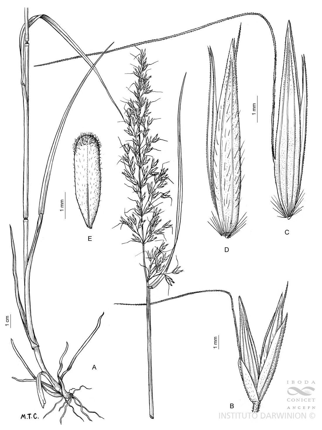 A, partes inferior y superior de la planta; B, espiguilla; C, antecio inferior; D, antecio superior; E, cariopse.