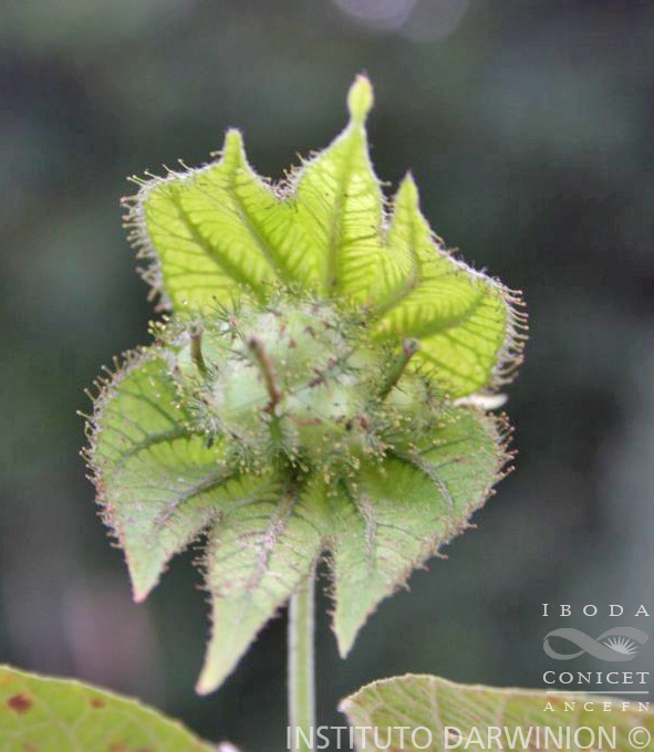 Liana voluble, hasta de 5 m de alto; tallos cilíndricos, estriados, híspidos, partes jóvenes pubescentes, glabrescentes; entrenudos hasta de 15 cm de largo. Hojas simples; pecíolos de 2,5-9 cm de largo; estipulillas en el ápice del pecíolo, pequeñas, laciniadas, glanduloso-estipitadas; estípulas foliáceas, ovadas, de 8-24 mm de largo, agudas o acuminadas, margen denticulado o subentero, fimbriado-glanduloso, pubescentes, a veces ± eglandulosas; paraestípulas fijadas arriba y por dentro de las estípulas foliares, de 5-13 mm de largo, palmatisectas, con lacinias aliformes, pubescentes, las distales fimbriado-glandulosas; lámina foliar suborbicular o anchamente ovada, de 5-18 × 5-21 cm, profundamente 3-lobada, rara vez con margen entero, base profundamente cordada, discolora; lóbulo medio ± elíptico, los laterales asimétricos, todos con ápice acuminado o agudo, ± densamente pubescentes, más en la cara abaxial, cara adaxial glabrescente, margen denticulado, ciliado, con glándulas estipitadas. Inflorescencias en pseudantos axilares y terminales; pedúnculos de 3-4 cm de largo; brácteas involucrales ovadas, de 2-2,5 cm de largo, verdosas, la base redondeada o levemente cordada, 3-lobadas, lóbulos agudos, glanduloso-fimbriados, pubescentes en las nervaduras o en toda la lámina; estípulas 4, ovado-lanceoladas, ca. 15 mm de largo, glanduloso-fimbriadas, acuminadas, pubescentes; címulas pistiladas con bráctea mediana anchamente ovada, ciliada, glandulosa, pubescente, las laterales soldadas, eglandulares. Flores estaminadas con cáliz 4-lobulado, lóbulos valvares, cóncavos; estambres 50-100. Flores pistiladas con 10-13 sépalos, pinatipartidos, lacinias numerosas, pubescentes, ápice capitado-glanduloso; ovario tomentoso; estilo cilíndrico, estigma poco dilatado. Fruto una cápsula obovoidea, ca. 12 × 7 mm, pubescente, acompañada por brácteas de ca. 4,5 cm de largo y sépalos setosos, acrescentes, de 8-12 mm de largo. Semillas ca. 5 mm de diámetro, lisas, grisáceas a rojizo-marmoradas.