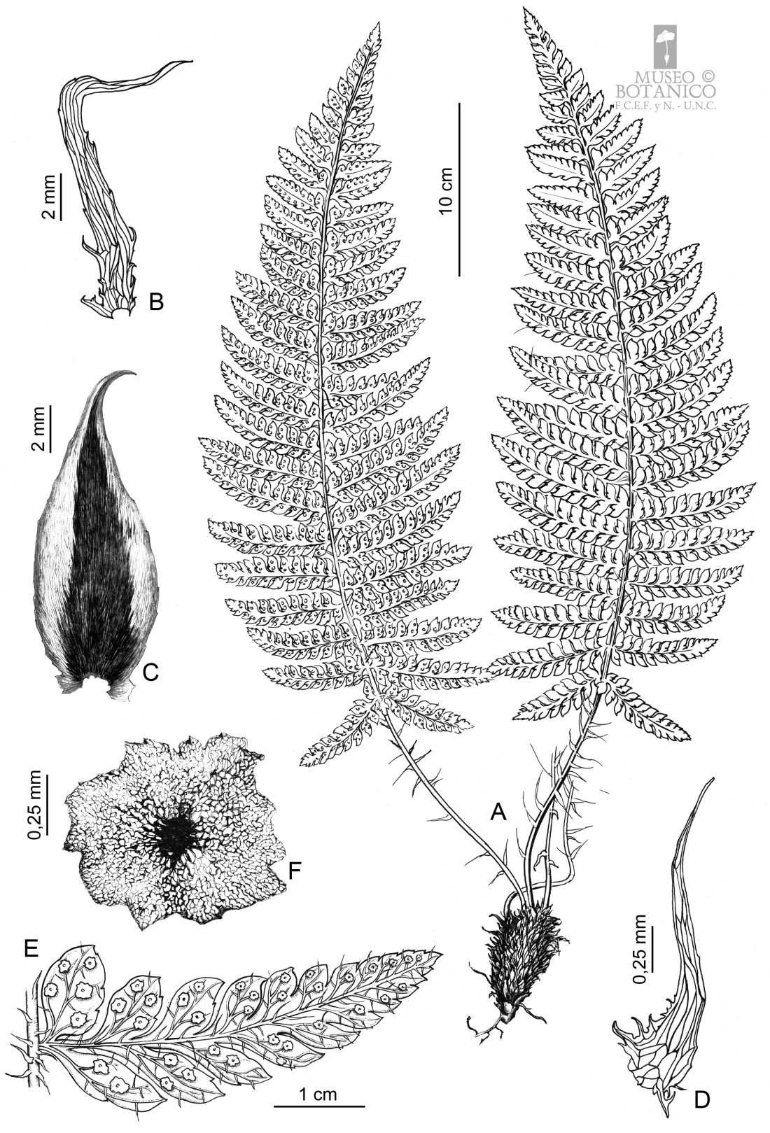 A. Planta. B. Escama del envés de las pínnulas. C. Escama de la porción media del pecíolo D. Escama del raquis. E. Pinna del sector apical de la lámina. F. Indusio en vista superior.