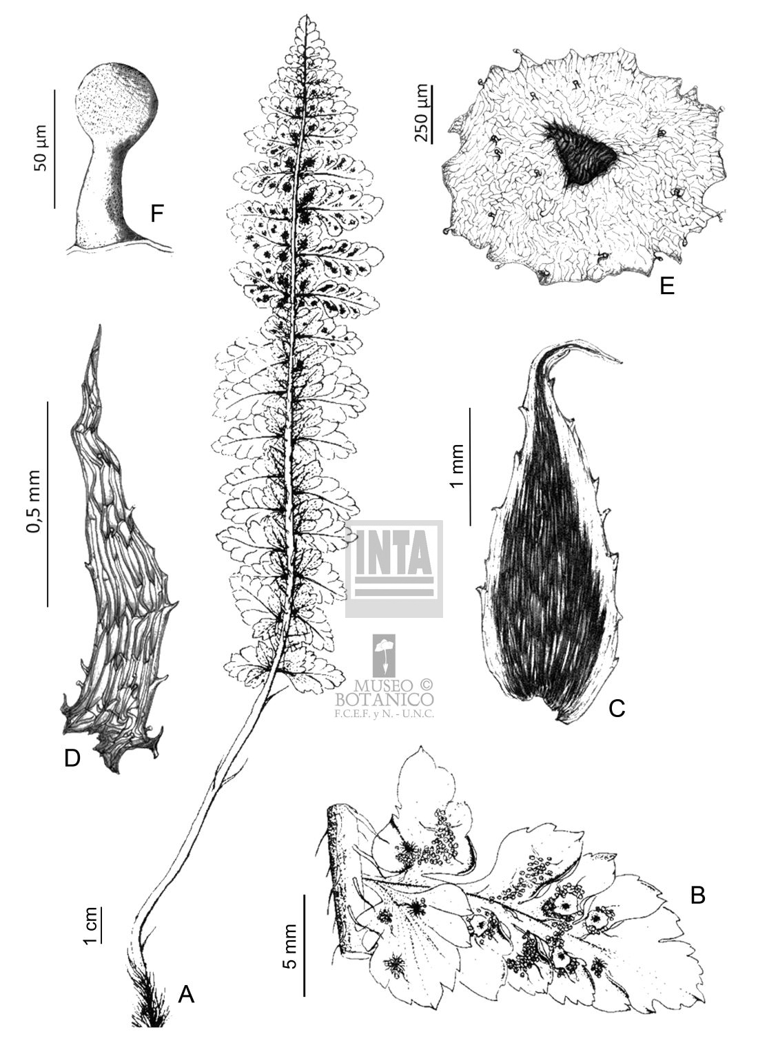 A. Fronde fértil. B. Pinna fértil, cara abaxial, mostrando los soros. C. Escama bicolor de la base del pecíolo. D. Escama concolor del raquis. E. Indusio. F. Tricoma glandular del indusio.