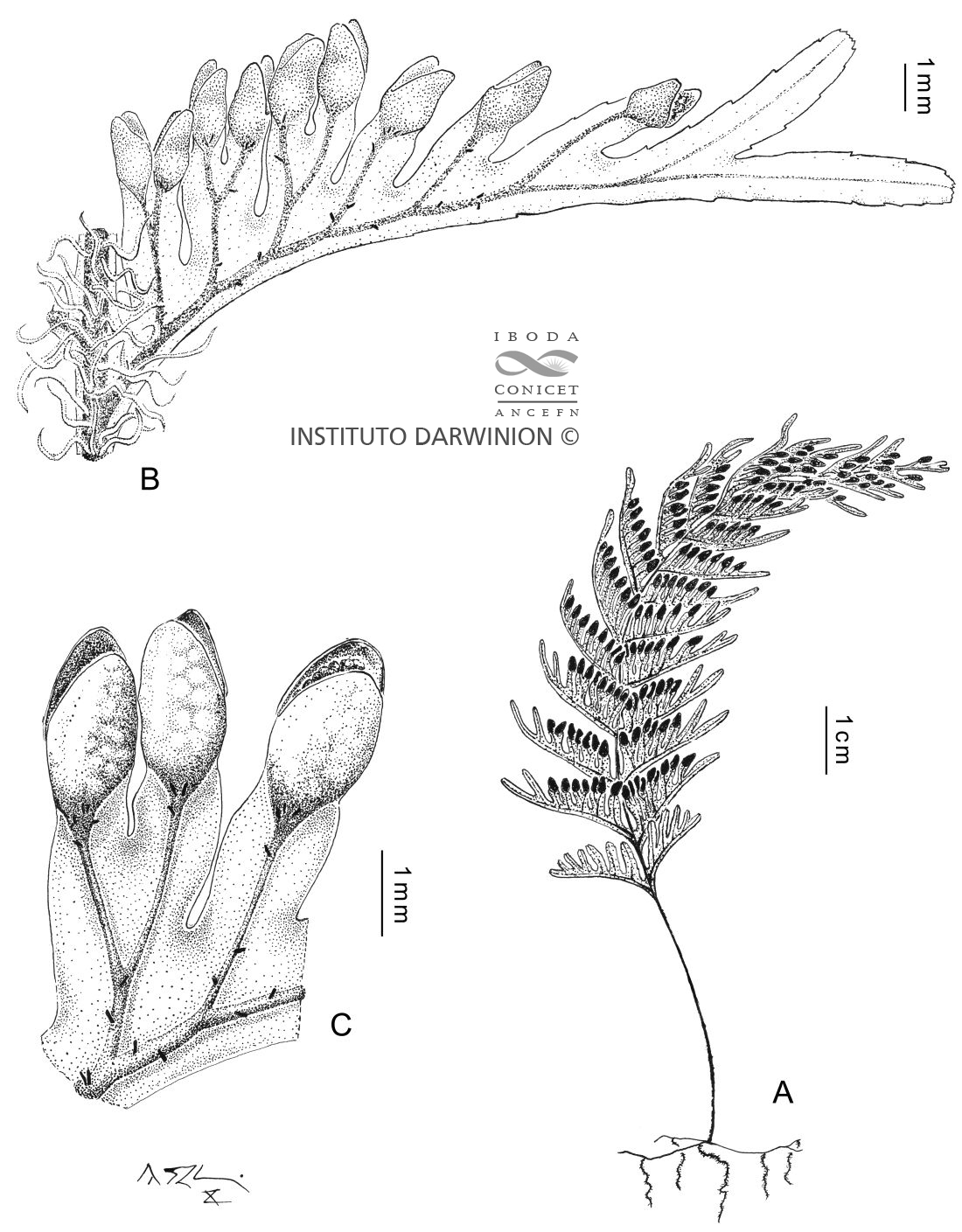 A. Planta. B. Detalle de una pinna fértil, en donde se pueden observar los pelos en el envés del raquis. C. Detalle de los indusios.