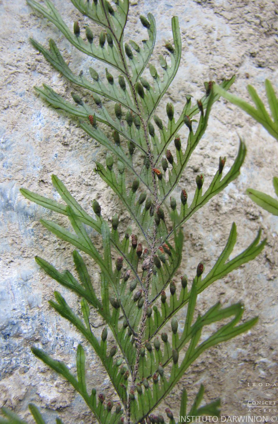 Rizomas filiformes, ramificados, pardo claros, ca. 0,7 mm de diámetro, con pelos simples, translúcidos, pluricelulares, delgados, largos, ca. 1,5 mm de largo, ausentes a la madurez. Frondes distantes, de 5-20 cm de largo; pecíolos pardo claros, de 2,5-10 cm de largo, glabros, teretes, ca. 0,4 mm de diámetro, no alados; láminas ovado-lanceoladas, 2-3-pinnatífidas, de 3-12 × 1,5-4 cm, glabras; pinnas alternas, imbricadas o no, subflabeladas a falcadas, pinnatífidas a 2-pinnatífidas, de 1,5-2 × 0,5-0,7 cm, con el lado acroscópico desarrollado, con papilas cortas sobre las nervaduras, parduscas, dispuestas espaciadamente; segmentos 5-8 por pinna, lineares u oblongos, hasta de 1,5 mm de ancho, de ápice redondeado, margen espaciadamente aserrado; raquis color castaño oscuro, teretes, no alados, con largos pelos paucicelulares, blancuzcos, sobre el lado del envés, ca. 1,4 mm de largo, adpresos en su base, de aspecto lanoso a reflexo en el ápice y continuándose sobre la base de las nervaduras de las pinnas. Soros en todas las pinnas, en el mismo plano de la lámina, sobre segmentos simples o bifurcados, más angostos o del mismo ancho que los indusios; indusios ovoideos a lanceolados, inmersos menos de la mitad en la lámina, de base obtusa, ápice agudo a obtuso, margen entero, abierto más de la mitad; receptáculos cilíndricos, insertos.