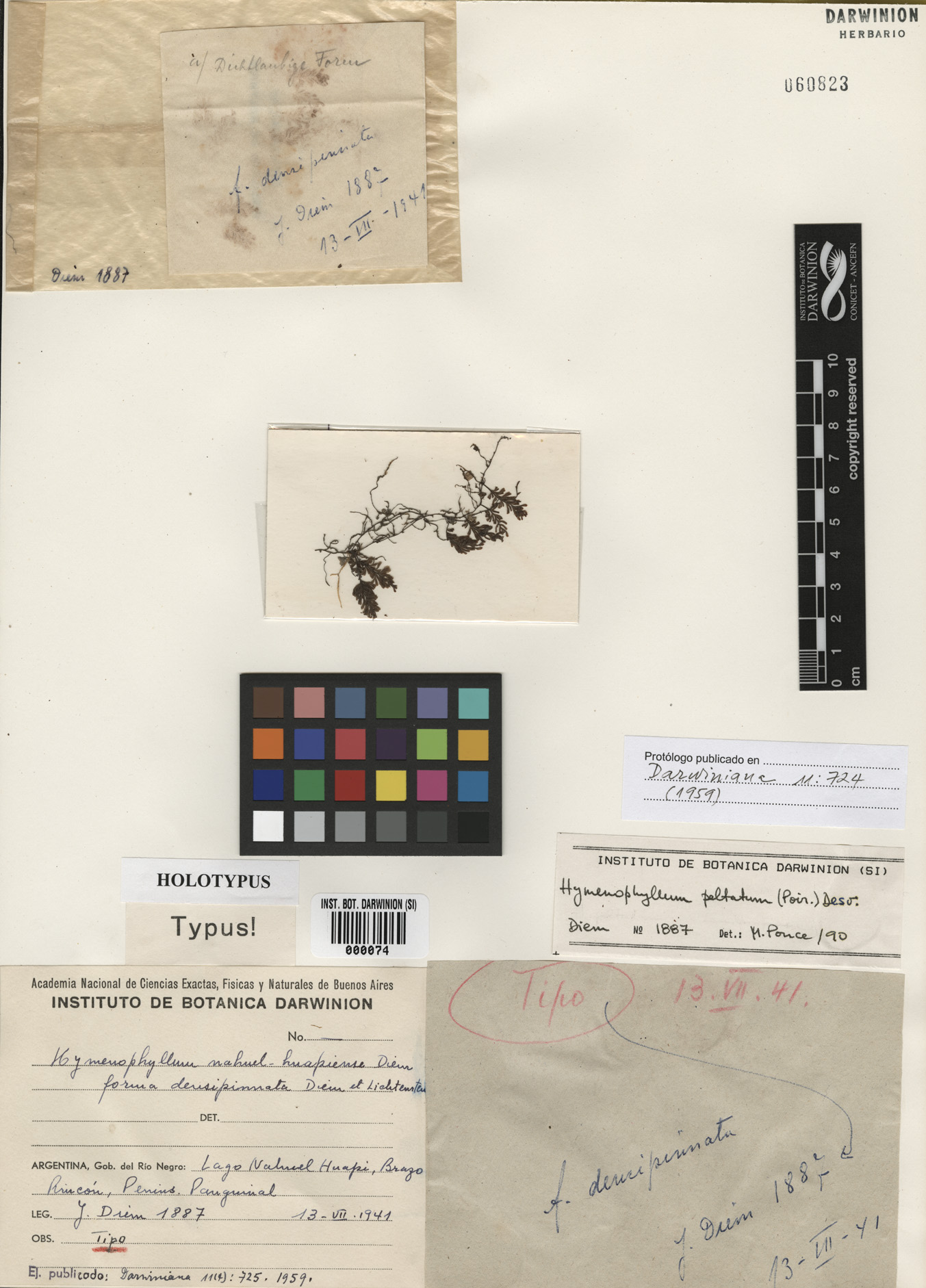 Tipo de Hymenophyllum nahuelhuapiense Diem & J.S. Licht. f. densipinnata Diem & J.S. Licht.