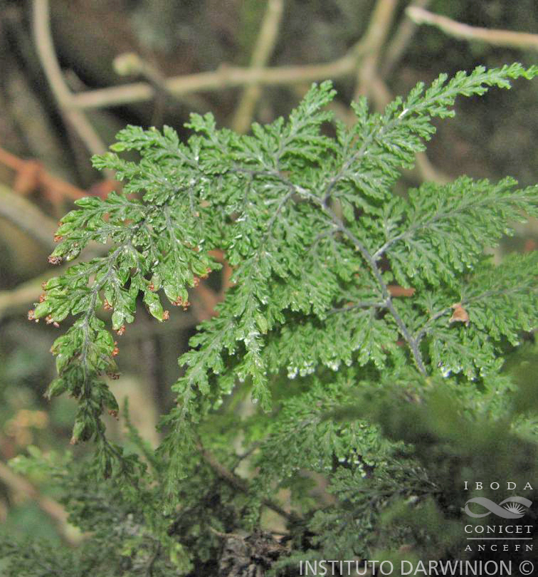 Rizomas ramificados, filiformes, pardo oscuros, de 0,4-1 mm de diámetro, con pelos pluricelulares (8 a 17 células), adnatos, simples, delgados, traslúcidos, de 0,9-1,9 mm de largo, más densos en la parte inferior del rizoma, caducos a la madurez, ocasionalmente con pelos adnatos con la base ensanchada. Frondes distantes, erectas, de 5-18 cm de largo; pecíolos teretes, parduscos o negros a la madurez, de 1,5-9 cm de largo, glabrescentes, con pelos adnatos de base más o menos desarrollada sobre el lado abaxial en las frondes jóvenes, que dejan un rastro al caerse, de 0,5-1 mm de diámetro, con alas caedizas de borde irregular muy ondulado; láminas ovadas a triangular-lanceoladas, de 3,5-13 × 1,5-5 cm, 3-4-pinnatífidas, membranáceas, brillantes; pinnas 14-26 pares por fronde, lanceoladas a ovado-lanceoladas, de 0,4- 2,5 × 0,5-1,4 cm, 2-3-pinnatifidas, ascendentes, simétricas; segmentos oblongos, ápice redondeado, margen irregular a dentado; raquis parduscos o negros a la madurez, alados, alas planas o muy onduladas, de borde irregular a laciniado. Soros en el mismo plano de la lámina, sobre segmentos terminales; indusios globosos, elipsoideos a elipsoideolanceolados, inmersos menos de la mitad en el segmento, la base aguda, el ápice agudo a cuspidado, glabro, a veces dividido en 3 o 4 valvas, abierto hasta la mitad o más; receptáculos filiformes, insertos.