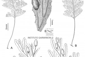 Rizomas filiformes, ramificados, parduscos, ca. 0,4 mm de diámetro; pelos del rizoma castaño claros a translúcidos, simples, paucicelulares, ca. 0,5 mm de largo, adpresos en su base y separándose hacia el ápice, dispersos, más densos en la base del pecíolo. Frondes distantes, de 3-10 cm de largo; pecíolos castaño oscuros, de 1-4 cm de largo, teretes, ca. 0,25 mm de ancho, alados, con escasos pelos similares a los del rizoma; láminas ovado-lanceoladas, de 2-6 × 1-2 cm, 2-pinnatífidas, membranáceas, glabras; raquis castaño oscuros, con pelos dispersos, parduscos, ca. 0,4 mm de largo, similares a los del rizoma, alados desde el primer par de pinnas, ensanchándose hacia el ápice, de margen entero; pinnas flabeladas, las basales más divididas, las medias y apicales hasta 2-pinnatífidas con segmentos sólo hacia el lado acroscópico, de 0,5-1 × 0,3-0,6 cm, las basales subopuestas, volviéndose alternas hacia el ápice, con papilas bulbosas parduscas sobre los ejes en el envés; segmentos 4-5 por pinna, oblongos, ca. 1 mm de ancho, de ápice redondeado a obtuso, margen espaciadamente aserrado, con dientes notables ca. 0,15 mm de largo. Soros sobre las pinnas medias y apicales, en el mismo plano de la lámina, sobre segmentos más o menos desarrollados, con alas del mismo ancho o más angostas que el indusio, en número de 1 a 2 por pinna y en general contiguos, subaxilares al raquis o no; indusios ovoideo-lanceolados a elipsoideos, inmersos hasta la mitad o menos en la lámina, de base aguda, engrosada, ápice agudo, margen entero, abierto más de la mitad; receptáculos cilíndricos, algo engrosados, insertos.