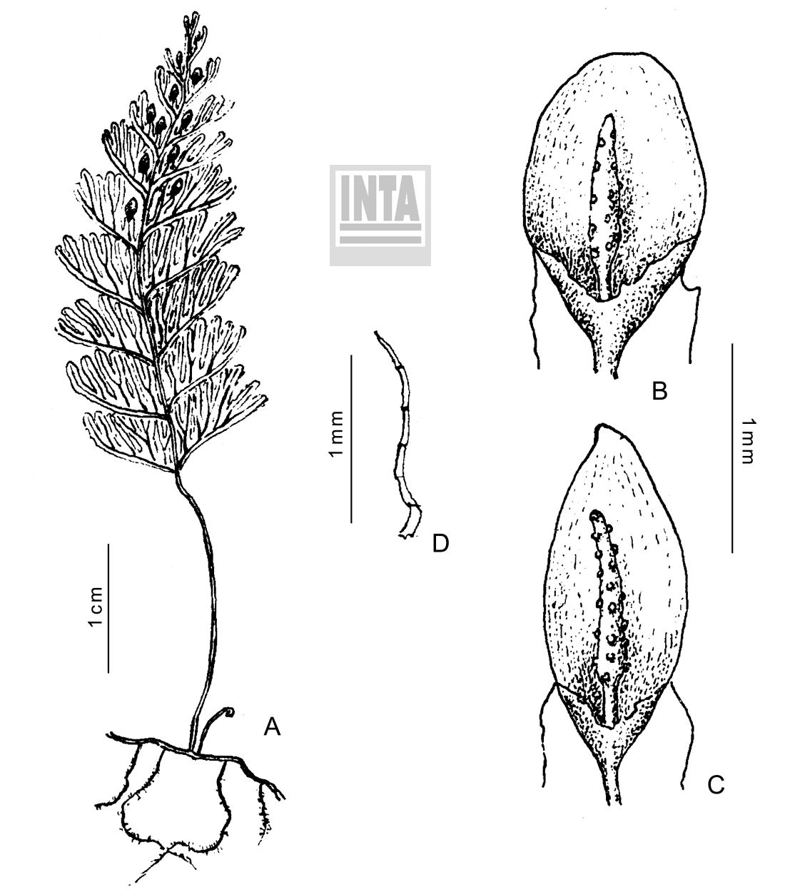 Rizomas filiformes, ramificados, parduscos, ca. 0,4 mm de diámetro; pelos del rizoma castaño claros a translúcidos, simples, paucicelulares, ca. 0,5 mm de largo, adpresos en su base y separándose hacia el ápice, dispersos, más densos en la base del pecíolo. Frondes distantes, de 3-10 cm de largo; pecíolos castaño oscuros, de 1-4 cm de largo, teretes, ca. 0,25 mm de ancho, alados, con escasos pelos similares a los del rizoma; láminas ovado-lanceoladas, de 2-6 × 1-2 cm, 2-pinnatífidas, membranáceas, glabras; raquis castaño oscuros, con pelos dispersos, parduscos, ca. 0,4 mm de largo, similares a los del rizoma, alados desde el primer par de pinnas, ensanchándose hacia el ápice, de margen entero; pinnas flabeladas, las basales más divididas, las medias y apicales hasta 2-pinnatífidas con segmentos sólo hacia el lado acroscópico, de 0,5-1 × 0,3-0,6 cm, las basales subopuestas, volviéndose alternas hacia el ápice, con papilas bulbosas parduscas sobre los ejes en el envés; segmentos 4-5 por pinna, oblongos, ca. 1 mm de ancho, de ápice redondeado a obtuso, margen espaciadamente aserrado, con dientes notables ca. 0,15 mm de largo. Soros sobre las pinnas medias y apicales, en el mismo plano de la lámina, sobre segmentos más o menos desarrollados, con alas del mismo ancho o más angostas que el indusio, en número de 1 a 2 por pinna y en general contiguos, subaxilares al raquis o no; indusios ovoideo-lanceolados a elipsoideos, inmersos hasta la mitad o menos en la lámina, de base aguda, engrosada, ápice agudo, margen entero, abierto más de la mitad; receptáculos cilíndricos, algo engrosados, insertos.