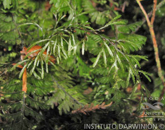 Rizomas filiformes, ramificados, castaño oscuros, ca. 0,3 mm de diámetro; pelos del rizoma castaños a traslúcidos, simples, de 0,2 mm de largo, escasos, concentrados en la base de raíces y pecíolos. Frondes distantes, de 5-15(-25) cm de largo; pecíolos castaño oscuros, brillosos, de 2-3,5 cm de largo y 0,4-0,5 mm de diámetro, no alados u, ocasionalmente, con alas delgadas, caedizas en su porción apical, glabros; láminas lanceoladas a rómbicas, de 3-15 × 1-5 cm, 3-4- pinnatífidas, membranáceas, glabras; pinnas inferiores flabeladas, las superiores trapeziformes, 2-3-pinnatífidas, de 1-1,5 × 0,5-1 cm, alternas o en ocasiones las basales subopuestas, formadas por un eje principal recto que se arquea a la madurez, generando divisiones dicotómicas que originan segmentos hacia el lado acroscópico, éstos a su vez divididos dicotómicamente y reflexos a la madurez; segmentos lineares a oblongos, de 0,6-0,9 mm de ancho, ápice redondeado a trunco, margen aserrado, usualmente revoluto, con dientes pronunciados hasta de 0,15 mm de largo, distanciados aprox. 1 mm entre sí por senos redondeados; raquis castaño oscuros, brillantes, angostamente alados en su base ensanchándose hacia el ápice hasta 0,15 mm, de margen entero, glabro. Soros en la porción apical de la fronde, en general 1-3 por pinna, hacia el lado acroscópico de la misma, arqueados en la base, subaxilares sobre un corto segmento apenas alado; indusios ovoideos a elipsoideos o romboidales, globosos, no inmersos en la lámina, de base engrosada y ápice redondeado a agudo, margen entero, valvas abiertas hasta más de la mitad; receptáculos cilíndricos, exertos.