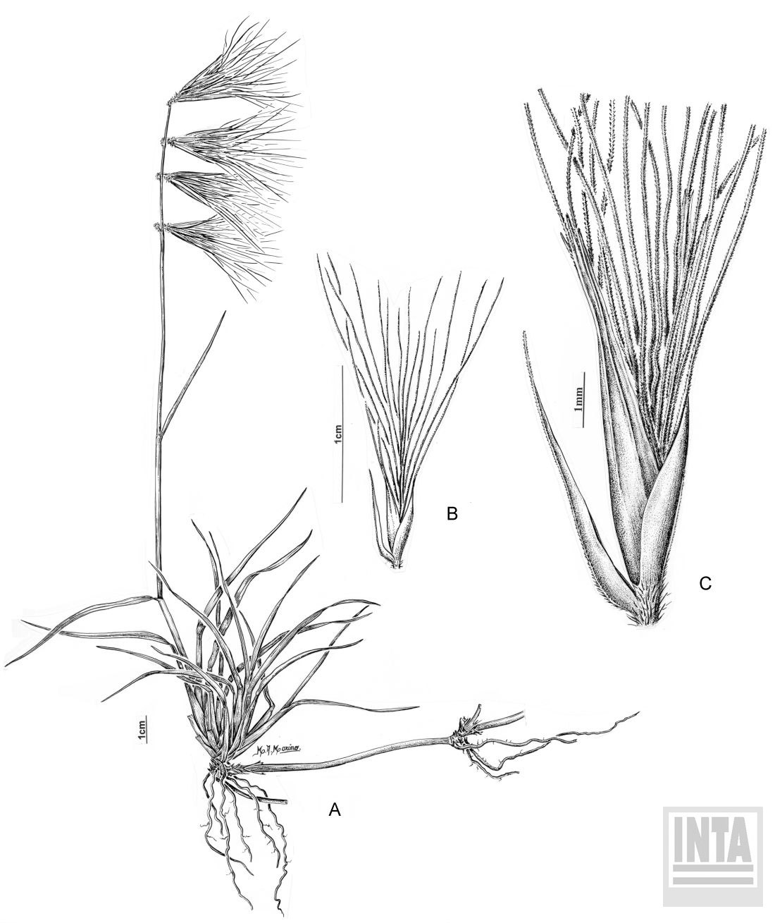 Plantas perennes, estoloníferas; cañas de 15-25 cm de alto, ascendentes, con hojas basales; vainas glabras; lígulas ciliadas, de 0,4 mm de largo; láminas de 3-10 cm x 2-3 mm, ralamente pilosas, planas a involutas, firmes, angostas y de ápice acuminado. Inflorescencias de 10-15 cm de largo, con 2-6 espigas de 2,5-3,5 cm de largo, erectas o ascendentes, deciduas a la madurez, cada espiga con 3-10 espiguillas congestas; raquis aplanado, lanoso, terminando en 2 aristas iguales o desiguales de 8-10 mm de largo. Espiguillas de 9-12 mm de largo, persistentes en los racimos; glumas desiguales, 1-nervias, glabras; gluma inferior de 5-6 mm de largo, angosta, reducida, setácea o gradualmente adelgazándose hacia una arista, escabriúscula a glabra; gluma superior de 8-11 mm de largo, más ancha que la inferior, 1-3-aristada, con un nervio medio robusto y escabriúsculo; lemma de la flor perfecta de 9-12 mm de largo (incluidas las aristas), lisa, brillante, 3-aristada, las aristas desiguales, la terminal de 2-3 mm de largo, más larga y más robusta que las laterales, usualmente con 2 setas delgadas en la base; pálea de 8-9 mm de largo, 2-aristada; flores rudimentarias 2-4, densamente congestas, reducidas a 3 aristas de 2-3 cm de largo, con 2 setas membranáceas en la base; cariopsis cilíndrica-obovada, de 2-2,5 mm de largo.