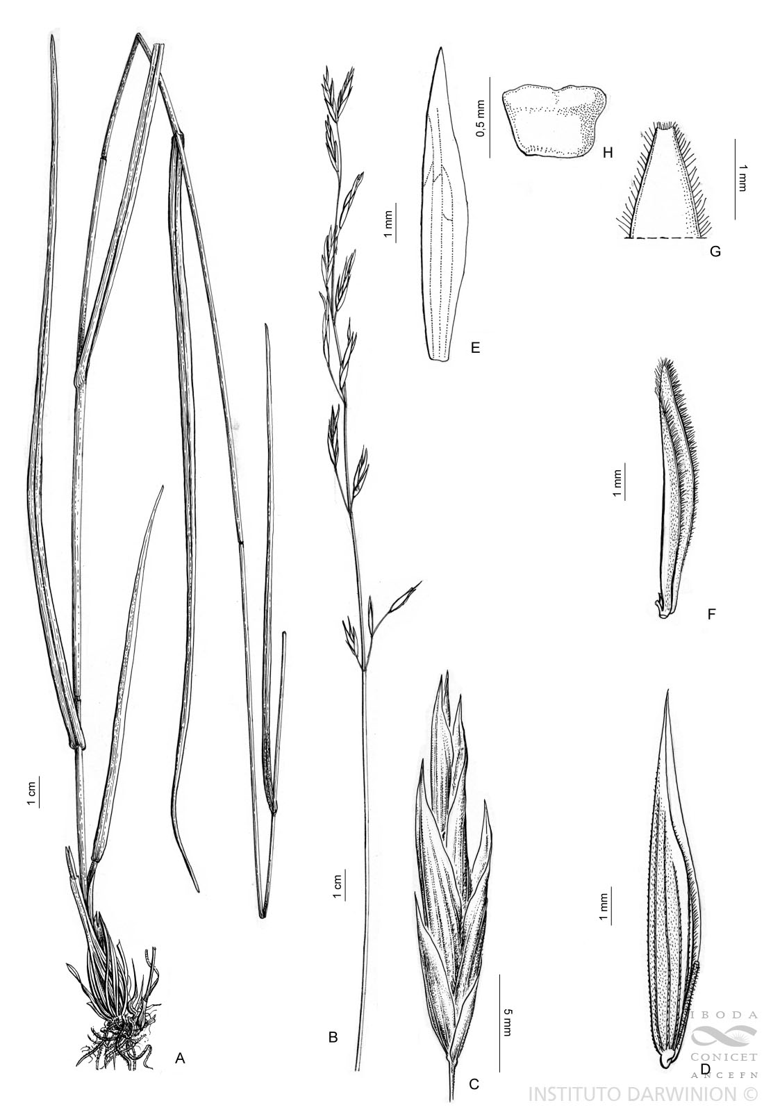 Plantas perennes, cespitosas, cortamente rizomatosas; cañas de 20-100 cm de altura, erguidas, engrosadas en la base, formado un pseudobulbo, rígido, rodeado de vainas fibrosas; entrenudos de 5-15 cm de largo, cilíndricos, glabros; nudos comprimidos, glabros, castaños; vainas menores que los entrenudos, las inferiores superpuestas, cerradas, pubescentes a glabras, retrorso-escabrosas; ligulas de 2-2,3 mm de largo, membranáceas, de ápice erosado; láminas lineares, de 10-30 cm x 1-3 mm, planas a convolutas, escabrosas, glabras, finamente escabriúsculas, de base atenuada, el ápice agudo, los márgenes escabrosos. Inflorescencia una panoja contraída, de 7-20 x 1 cm, erecta; pedúnculo exerto, hasta de 35 cm de largo, cilíndrico, glabro; eje principal anguloso a triquetro, glabro; ramificaciones ascendentes, adpresas al eje principal, glabras; pedicelos filiformes, rectos, glabros, escabrosos. Espiguillas largamente elipsoides, de 11-20 x 3-5 mm, comprimidas lateralmente, pajizas o con tintes violáceos, glabras, 4-6-floras, las inferiores perfectas, las superiores neutras, reducidas a la lemma; raquilla articulada por encima de las glumas, glabra, escabrosa, con artejos filiformes, hasta de 3 mm de largo, fácilmente caedizos; glumas lanceoladas, desiguales, aquilladas, glabras, finamente escabrosa sobre los nervios y porción media, menores que los antecios contiguos, con los márgenes membranáceos, glabros; gluma inferior de 5-7 mm de largo, 3-nervia, con los nervios libres; gluma superior de 6-9 mm de largo, 5-7-nervia, con los nervios libres; lemma inferior lanceolada, de 1,4-1,7 mm de largo, de ápice acuminado a ligeramente obtuso, aquillada, finamente escabrosas sobre los nervios y la poción media, los márgenes lisos, 7-nervia, con los nervios centrales anastomosados en el ápice, los laterales libres; callo glabro; pálea inferior estrechamente lanceolada, de 6,5-8 mm de largo, biaquillada, pestañosa en la porción superior sobre las quillas, 2-nervia; callo glabro; lodículas 2, ca. 0,4 mm de largo; estambres 3, anteras de 3-2 mm de largo; ovario glabro; cariopsis fusiforme, ca. 4,5 mm de largo, surcada, castaño clara; hilo linear.