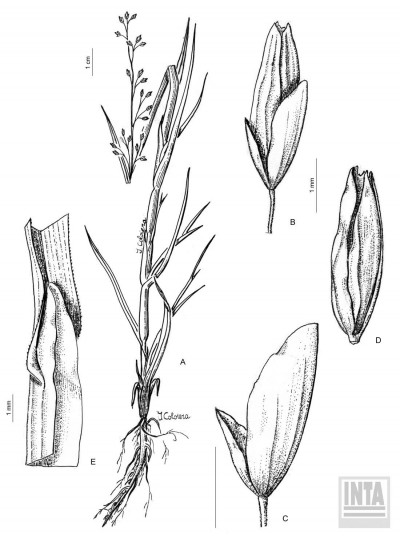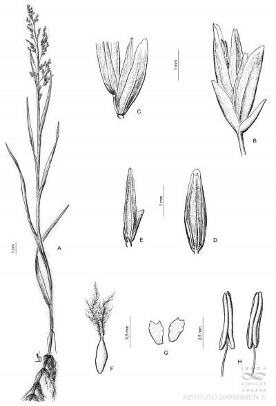 Plantas perennes, cortamente rizomatosas, estoloníferas, cañas de 10-30 cm de alto, erectas a decumbentes; entrenudos lisos, esponjosos, glabros; nudos glabros; vainas usualmente mayores que los entrenudos, superpuestas, abiertas, glabras, los márgenes membranáceos; lígulas membranáceas, de 3-8 mm de largo, glabras; láminas lineares, de 2-8 x 0,2-0,5 cm, planas a conduplicadas, base atenuada, de ápice cimbiforme, los márgenes lisos. Inflorescencia una panoja de 5-10 x 2-7 cm, laxa, abierta; eje principal terete, glabro, ramificaciones de primer orden varias por nudo, divergentes, eje de las ramificaciones flexuoso, glabro, delicado, desnudo en la parte basal; pedicelos de 0,5-2 mm, triquetros, escabriúsculos, glabros. Espiguillas largamente elipsoides, de 3-5 x 1-2 mm, 1-3 floras, cobrizas a ferrugíneas, glabras; glumas subiguales, más cortas que la espiguilla, membranáceas, lisas, de ápice obtuso, púrpuras a blanquecinas; gluma inferior ovada a elíptica, de 1-1,5 mm de largo, 1-nervia, obtusa, con ápice redondeado; la gluma superior de 1,5-2,5 mm de largo, hasta ½ del largo de la espiguilla, 1-3-nervia, obtusa, con ápice redondeado; lemma largamente elíptica, de 2,5-3,5 mm de largo, el ápice subagudo, algo hialino, 3-nervia, los nervios conspicuos, glabra o esparcidamente pilosa sobre los nervios; pálea lanceolada, de igual longitud que la lemma, glabra o escabriúscula sobre las quillas, 2-nervia; estambres 3, anteras de 1,5 mm de largo, cariopsis de aprox. 2 mm de largo, con el hilo oval, embrión menos de ½ del largo de la cariopsis.