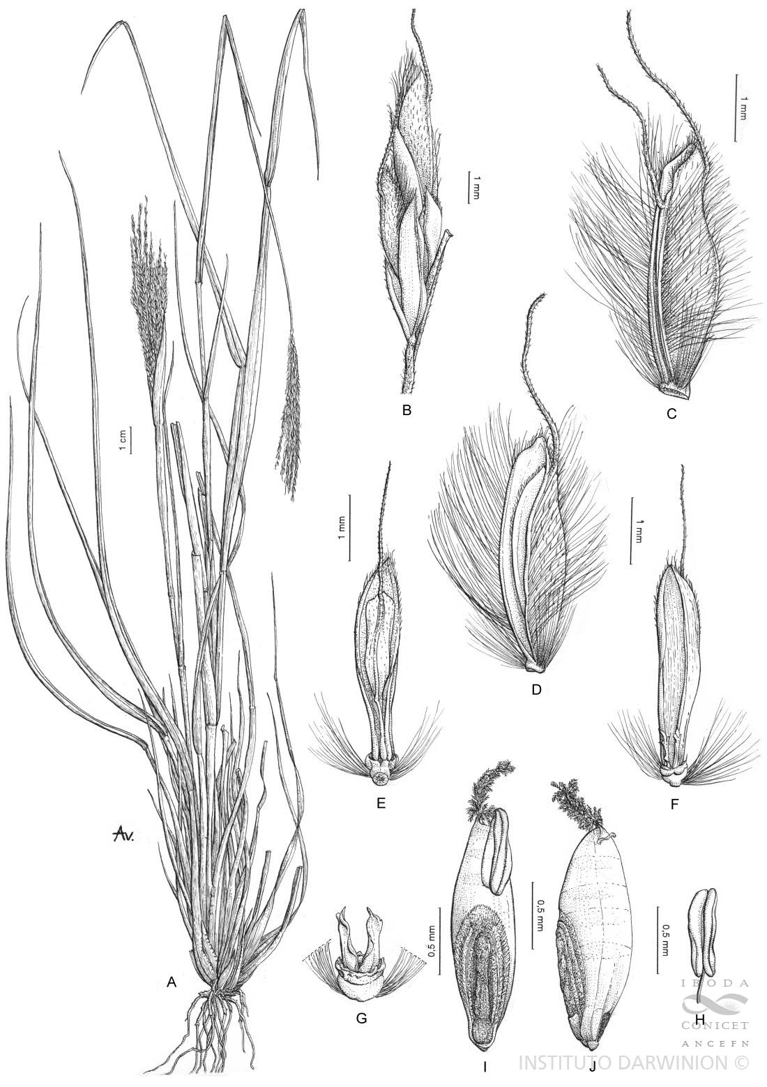 A. Planta. B. Porción del raquis con espiguillas. C. Antecios inferior y superior, vista lateral. D. Antecio inferior mostrando parte de la pálea. E. Pálea y antecio superior, vista dorsal. F. Pálea y lodículas, vista ventral. G. Lodículas y callo. H. Estambre. I. Cariopsis, vista escutelar. J. Cariopsis, vista lateral.