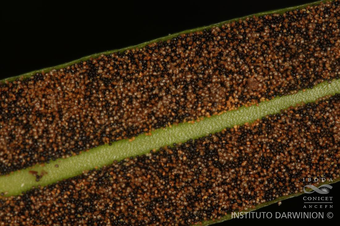 Rizomas largamente rastreros, con escamas abundantes y persistentes, peltadas, lanceoadas a deltoides, canelas, papiráceas. Frondes dimorfas, verde oscuras; pecíolos de 5-9 cm de largo, 1/2 - 2/3 de la longitud total de las frondes, próximos, rojizos, rígidos, surcados, articulados con filopodios, con escamas patentes, deciduas, canelas con ápice castaño; láminas simples, oblongas, de 4-10 × 0,6-1,5 cm, base cuneada, ápice agudo y margen revoluto, coriáceas; costas adaxialmente surcadas y abaxialmente lisas y prominentes; venas libres, oblicuas, no visibles, bifurcadas 1-2 veces a distintas alturas, con algunas geminadas; epifilo glabro, hipofilo casi glabro, con algunas escamas translúcidas, dispersas, caedizas, aracniformes y estrelladas. Frondes fértiles de mayor longitud que las frondes estériles; pecíolos de 6-12 cm de largo; láminas lineares, de 6-15 × 0,6-1 cm, con base aguda, ápice mucronado y margen revoluto. Soros acrosticoides. Esporas reniformes, muriformes, crestadas, con micro-ornamentación granular y equinada.