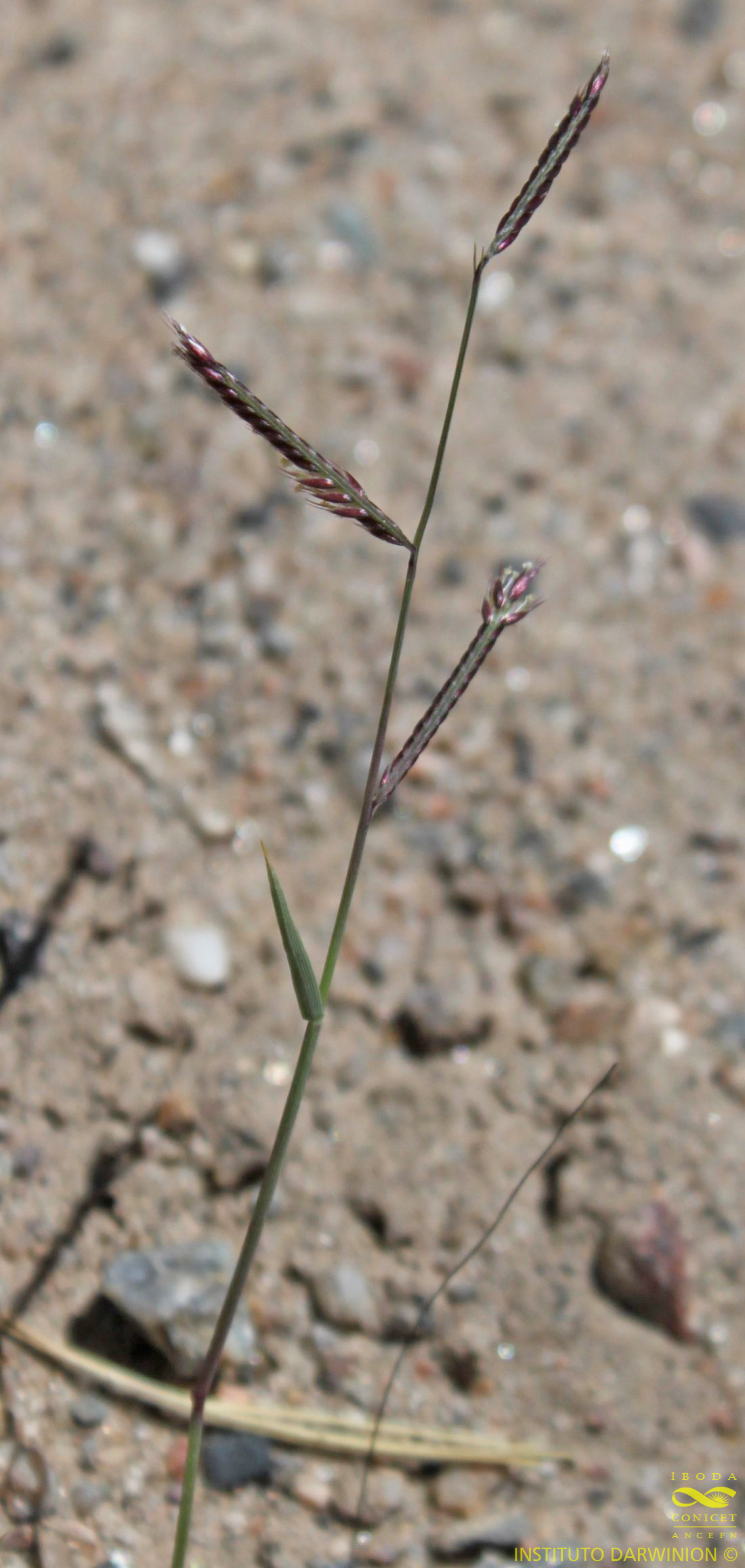 Plantas anuales, de tamaño y aspecto variable; cañas de 5-30(-50) cm de largo, erectas o decumbentes, nunca desarrollando estolones, entrenudos glabros; hojas persistentes, basales; vainas de 1-5 cm de largo, con el margen membranáceo-hialino; lígulas de 0,6-1 mm de largo, con pelos hialinos cortos y largos; láminas de 1-9 cm x 1-3 mm, rectas, planas, de ápice acuminado, escabrosas en la cara adaxial, con pelos papilosos a los lados del nervio medio y a veces en los nervios laterales, la cara abaxial escabrosa, a veces con pelos papilosos. Inflorescencias con (2-)7 (-11) espigas de 1-2,5 cm x 1,5-5 mm, unilaterales, persistentes, ligeramente curvadas, cada una con 20-30(-45) espiguillas; raquis recto, aplanado, escabroso. Espiguillas de 1-2,5 mm de largo, con desarticulación por encima de las glumas; glumas glabras, desiguales, ovado-lanceoladas, aquilladas, cortamente mucronadas; gluma inferior de 0,7-1,5 mm de largo, verde pálido a hialina; gluma superior de 1,5-2,5 mm de largo, purpúrea; lemma de la flor perfecta de 1,7-4 mm de largo, ligeramente pilosa en la base, 3-aristada, las aristas de 1,5-2 mm de largo, escabrosas, y cuatro dientes intercalados con las aristas; pálea de 1,5-4 mm de largo, pilosa, con 2 aristas escabrosas; flor rudimentaria de 1,5-4 mm de largo incluyendo las aristas, con 3 aristas escabrosas, divergentes, de 1-4 mm de largo y 3 lóbulos de 0,5-1 mm de largo; callo de 0,7-1 mm de largo, con un anillo piloso; cariopsis de 0,5-1,3 mm de largo.