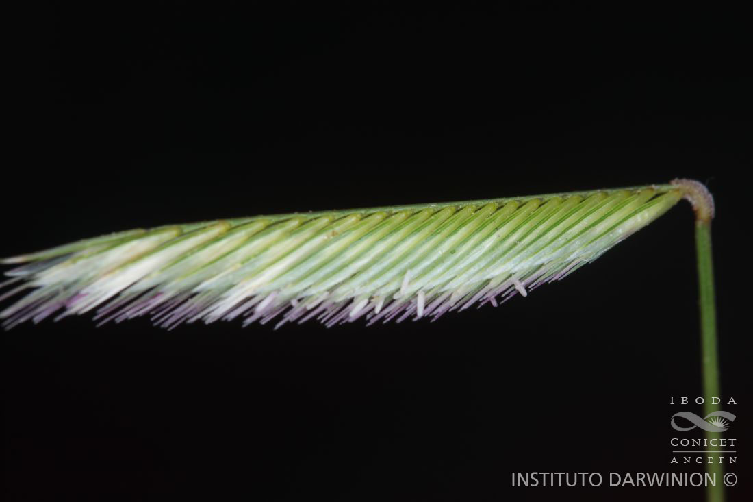 Plantas anuales; cañas de 3-23(-35) cm de alto, usualmente postradas en la mitad inferior, ascendentes en la porción distal a ocasionalmente erectas, glabras; vainas glabras, más cortas que los entrenudos; lígulas membranáceo-ciliadas, de 0,2-0,4 mm de largo; láminas de 2-8 cm x 0,5-1,5 mm, aplanadas en la base, involutas en la porción distal, glabras a pilosas en la cara adaxial y ciliadas en los márgenes por sobre la lígula. Inflorescencia una única espiga terminal, persistente, de 1-3 cm de de largo, generalmente curvada, con 20-80 espiguillas pectinadas. Espiguillas de 4-5 mm de largo, con desarticulación por encima de las glumas; raquilla con un mechón de pelos por debajo de la flor perfecta y de la primera flor rudimentaria; glumas glabras o escabrosas cerca del ápice, agudas a acuminadas; gluma inferior de 2-3 mm de largo, angosta, casi transparente; gluma superior de 3,5-5 mm de largo, más ancha que la inferior; lemma de 2,5-4 mm de largo, densamente pubescente sobre los nervios, los que se prolongan en aristas cortas, rígidas, aplanadas y escabrosas; arista central de 2 mm de largo, que emerge entre 2 lóbulos membranáceos, de 1 mm de largo; pálea ancha, de menor tamaño que la lemma; anteras de 1 mm de largo, de color amarillo claro; flor rudimentaria 1 ó a veces 2, la inferior formada por una columna de 1 mm de largo y 3 aristas de 1-2 mm de largo, robustas, escabrosas, planas; la superior, si presente, formada por pequeñas escamas; cariopsis de 1,8-2 mm de largo.