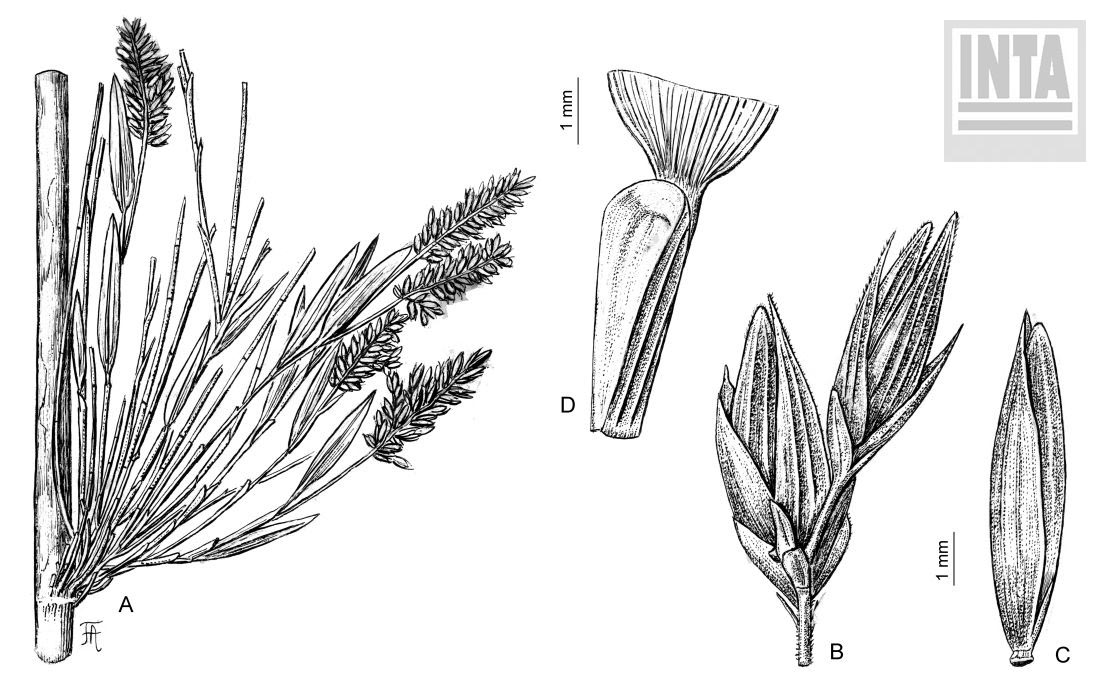 A, parte de la planta; B, espiguillas; C, antecio; D, lígula.