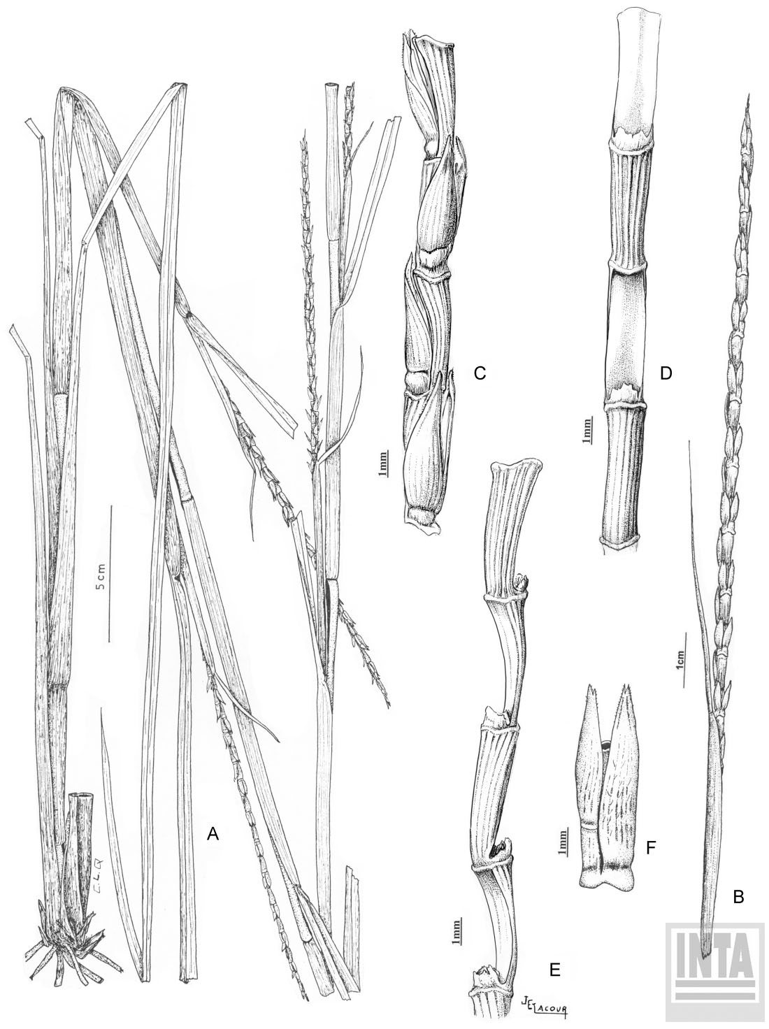 A. Planta. B. Porción distal de inflorescencia. C. Porción del raquis con espiguillas. D. Porción del raquis sin espiguillas. E. Porción del raquis sin espiguillas, vista lateral. F. Par de espiguillas.