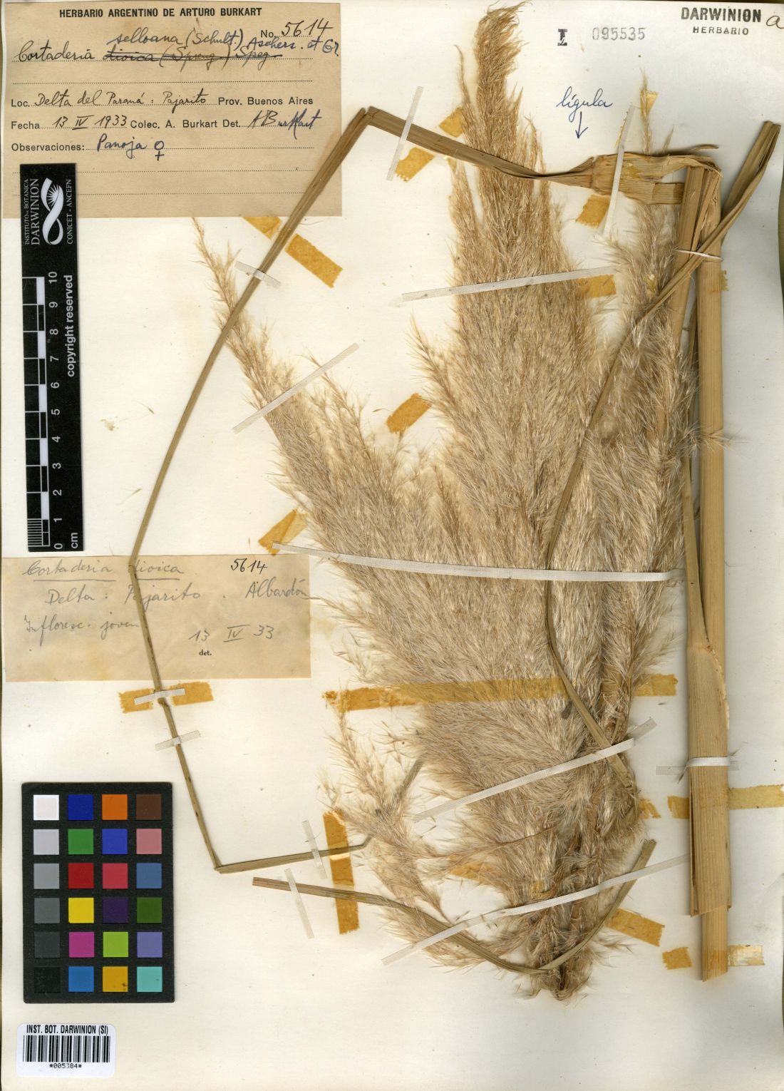Plantas cespitosas, ginodioicas de 0,9-3 m de alto, 10-12-nodes; nudos glabros; entrenudos cubiertos de pelos cortos, suaves y sedosos; vainas hasta de 50 cm de largo, con nervios transversales evidentes, enrollándose y eventualmente fragmentándose en segmentos a la madurez; lígulas hasta de 3 mm de largo; láminas lineares de 100-200 cm x 6-20 mm, discolores, acuminadas, las maduras enrolladas, fuertemente retroescabrosas y pilosas en los bordes, nervaduras y collar. Inflorescencias terminales, laxas, de 20-65 cm de largo, blanco-plateadas o algo violáceas, plumosas, erectas; raquis cubierto de tricomas diminutos, suaves y sedosos, más largos y densos en los nudos. Espiguillas 4-6-floras; glumas subiguales, hasta de 12 mm de largo, menores que los antecios, 1-nervias, violáceas, agudas, a veces 2-fidas o terminadas en dientes o mucrones; lemma hasta de 15 mm de largo, 3-nervia, aristiforme, terminada en dos dentículos apicales entre los que emerge un breve mucrón hasta de 0,3 mm de largo, con pelos hasta de 10 mm de largo, abundantes en todo el cuerpo en los antecios pistilados, y otros menores (ca. 7 mm de largo) en la base de la lemma en los antecios perfectos; pálea hasta de 4 mm de largo, quillas y ápice ciliados, dorso y márgenes escabrosos; callo piloso; lodículas hasta de 0,7 mm de largo; flores perfectas con anteras hasta de 4,5 mm de largo; flores pistiladas con estaminodios de hasta 0,1 mm; cariopsis ca. 2,5 mm de largo; las flores pistiladas son las que fructifican ya que las perfectas son escasas y con bajo éxito reproductivo, con lo cual el sistema, en la práctica, se acerca a la dioecia.