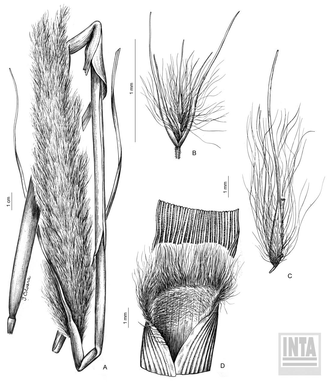 Plantas cespitosas, ginodioicas de 0,9-3 m de alto, 10-12-nodes; nudos glabros; entrenudos cubiertos de pelos cortos, suaves y sedosos; vainas hasta de 50 cm de largo, con nervios transversales evidentes, enrollándose y eventualmente fragmentándose en segmentos a la madurez; lígulas hasta de 3 mm de largo; láminas lineares de 100-200 cm x 6-20 mm, discolores, acuminadas, las maduras enrolladas, fuertemente retroescabrosas y pilosas en los bordes, nervaduras y collar. Inflorescencias terminales, laxas, de 20-65 cm de largo, blanco-plateadas o algo violáceas, plumosas, erectas; raquis cubierto de tricomas diminutos, suaves y sedosos, más largos y densos en los nudos. Espiguillas 4-6-floras; glumas subiguales, hasta de 12 mm de largo, menores que los antecios, 1-nervias, violáceas, agudas, a veces 2-fidas o terminadas en dientes o mucrones; lemma hasta de 15 mm de largo, 3-nervia, aristiforme, terminada en dos dentículos apicales entre los que emerge un breve mucrón hasta de 0,3 mm de largo, con pelos hasta de 10 mm de largo, abundantes en todo el cuerpo en los antecios pistilados, y otros menores (ca. 7 mm de largo) en la base de la lemma en los antecios perfectos; pálea hasta de 4 mm de largo, quillas y ápice ciliados, dorso y márgenes escabrosos; callo piloso; lodículas hasta de 0,7 mm de largo; flores perfectas con anteras hasta de 4,5 mm de largo; flores pistiladas con estaminodios de hasta 0,1 mm; cariopsis ca. 2,5 mm de largo; las flores pistiladas son las que fructifican ya que las perfectas son escasas y con bajo éxito reproductivo, con lo cual el sistema, en la práctica, se acerca a la dioecia.