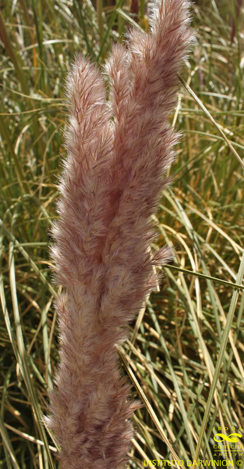 Plantas exclusivamente pistiladas, apomícticas, cespitosas, formando matas densas, de 1,20-2(-3) m de alto; láminas lineares de (50-)80-100(-150) cm x 5-10 mm, finamente atenuadas, carinadas, carinas y márgenes escabrosos; lígulas pilosas, de 2-5 mm de largo. Inflorescencias de (20-)40-60 cm de largo, oblongas, abiertas, plateado lustroso a purpúreas; ramas de 10-25 cm de largo, adpresas. Espiguillas 3-4(-6)-floras, de 9-10 mm de largo; callo piloso, pelos de 0,6-1 mm de largo; glumas de 7-10 mm de largo, subiguales, más cortas que la espiguilla, similares a la lemma, 1-nervias; lemma inferior hialina, de 7,5-10,5 mm de largo, 3-nervia, pilosa en la porción basal del cuerpo, glabra hacia arriba, ápic atenuado, mútico o aristado, arista hasta de 2,5 mm de largo; pálea de 3-4,5 mm de largo, carinas cilioladas, ápice entero o denticulado; flores pistiladas con lodículas cuneadas, ciliadas; estaminodios de 0,1-0,3 mm de largo, inclusos o no en las lodícu¬las.