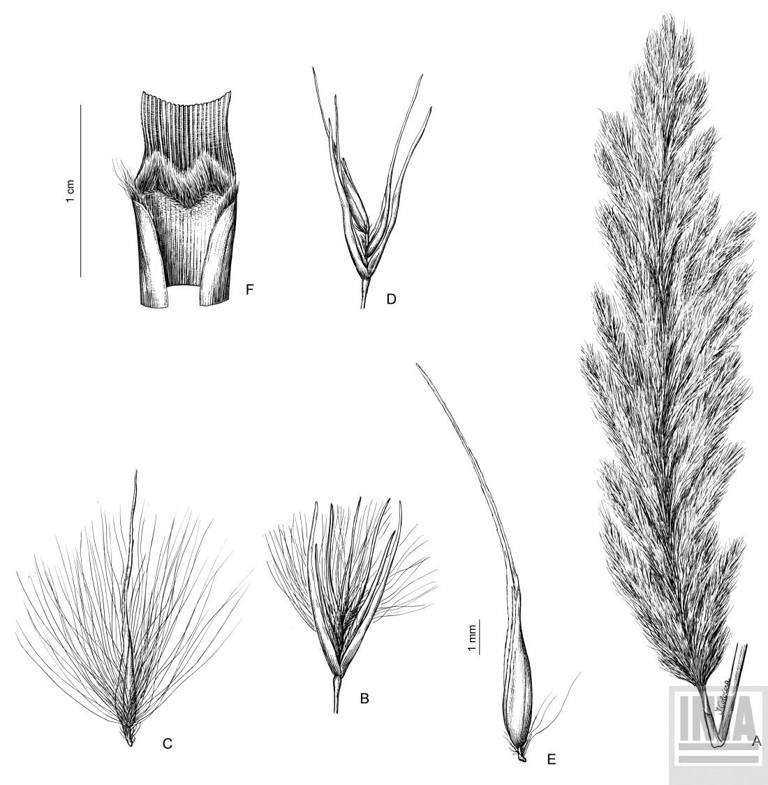 Plantas exclusivamente pistiladas, apomícticas, cespitosas, formando matas densas, de 1,20-2(-3) m de alto; láminas lineares de (50-)80-100(-150) cm x 5-10 mm, finamente atenuadas, carinadas, carinas y márgenes escabrosos; lígulas pilosas, de 2-5 mm de largo. Inflorescencias de (20-)40-60 cm de largo, oblongas, abiertas, plateado lustroso a purpúreas; ramas de 10-25 cm de largo, adpresas. Espiguillas 3-4(-6)-floras, de 9-10 mm de largo; callo piloso, pelos de 0,6-1 mm de largo; glumas de 7-10 mm de largo, subiguales, más cortas que la espiguilla, similares a la lemma, 1-nervias; lemma inferior hialina, de 7,5-10,5 mm de largo, 3-nervia, pilosa en la porción basal del cuerpo, glabra hacia arriba, ápic atenuado, mútico o aristado, arista hasta de 2,5 mm de largo; pálea de 3-4,5 mm de largo, carinas cilioladas, ápice entero o denticulado; flores pistiladas con lodículas cuneadas, ciliadas; estaminodios de 0,1-0,3 mm de largo, inclusos o no en las lodícu¬las.