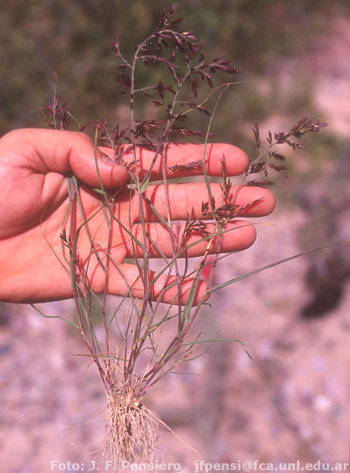 Plantas de 30-50 cm de alto; vainas pilosas, más cortas o más largas que sus entrenudos,; lígulas de 1 mm de largo; láminas de 5-20 cm x 4-6 mm. Inflorescencia de 6-20 cm de largo. Glumas de 4,5-5 mm de largo; lemma de 3-4 mm de largo; pálea de 2,5-3 mm de largo; cariopsis oblonga de 1-1,3 mm de largo.