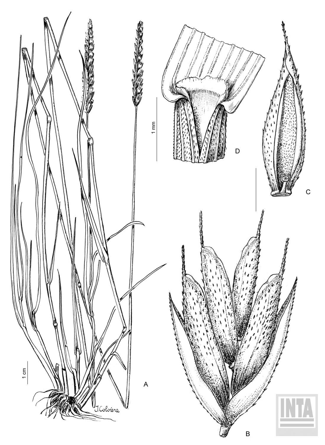 A. Planta. B. Espiguilla fértil, vista lateral. C. Antecio, vista ventral. D. Región ligular.