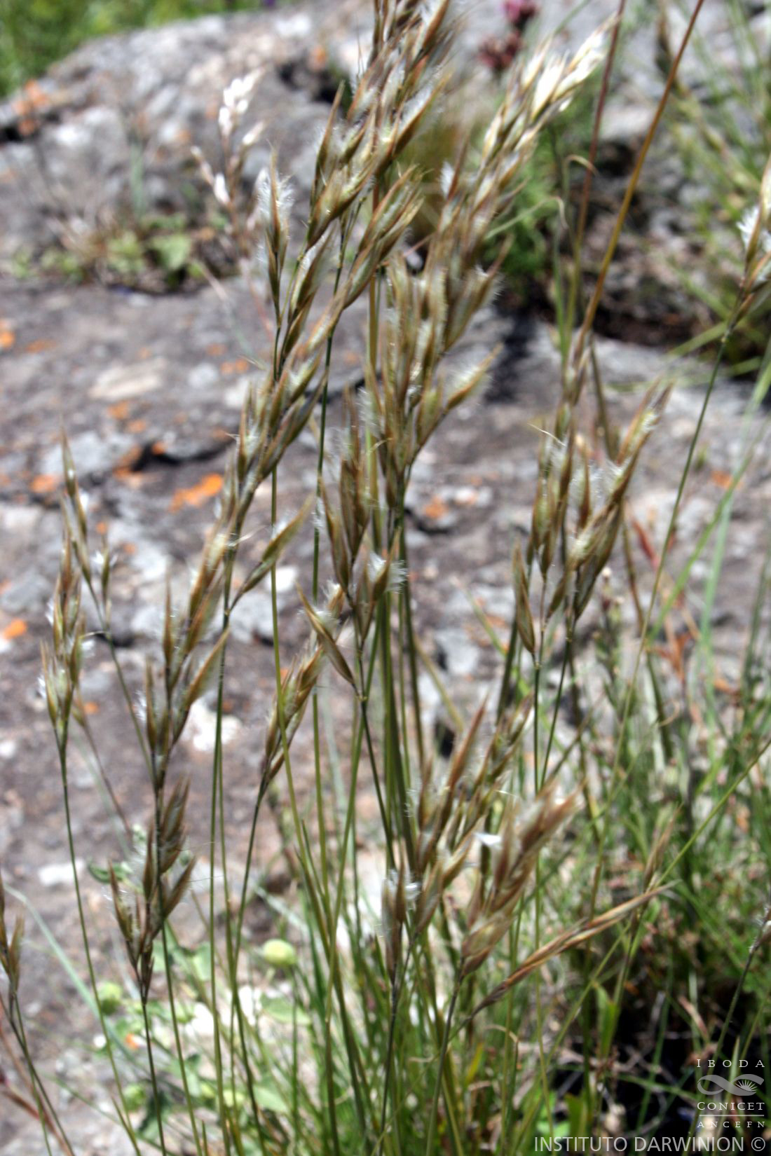 Plantas cespitosas densas, con innovaciones intravaginales, cortamente rizomatosas; cañas 1-4-nodes, de (7)20-80 cm de alto; hojas en la base de las cañas; vainas estriadas, glabras, con manojos de pelos a los costados de la lígula; lígulas pestañosas con pelos de 0,5-1 mm; láminas planas o conduplicadas, glabras o con escasos pelos en la cara abaxial de 5-15 cm de largo. Panojas oblongas de 3-13 cm de largo, con (2)3-30(70) espiguillas; raquis, ramificaciones y pedicelos pubescentes. Espiguillas 5-12-floras, lanceoladas de 15-30 mm de largo; glumas más largas que los antecios, lanceoladas, agudas, glabras, carinadas, con frecuencia violáceas, traslúcidas, de 10-23 mm de largo, la inferior un poco más larga, 3-9-nervias; callos pilosos de 0,5-1 mm; lemmas ovado-lanceoladas, bífidas, 5-9-nervias, pilosas, con pelos largos de hasta 5 mm en el tercio basal, dorso y márgenes del cuerpo, de 7-13 mm de largo (cuerpo 1,8-3 mm), los lóbulos laterales de 5-10(12) mm, prolongados en aristas rectas de 1,5-5 mm de largo; aristas dorsales retorcidas de 10-16 mm de largo; páleas obovadas, de la hemialtura de la lemma, finamente ciliadas en los márgenes; lodículas 2, en general con bordes ciliados, de 0,5-0,9 mm de largo; estambres 3; anteras de 1,5-2,9 mm de largo en flores casmógamas y de 0,2-0,5 mm en flores cleistógamas de las panojas aéreas; cariopsis ovoides u obovoides, castaño claras, de 1,2-2,3 mm de largo, hilo alargado; espiguillas cleistógamas en las vainas de las hojas basales presentes, formadas por lemma rígida de 5-12 mm de largo, arqueada, lisa y lustrosa, apiculada; páleas aquilladas sobre uno de los nervios, similares en textura a las lemmas; cariopsis asimétricas, envueltas por el profilo.