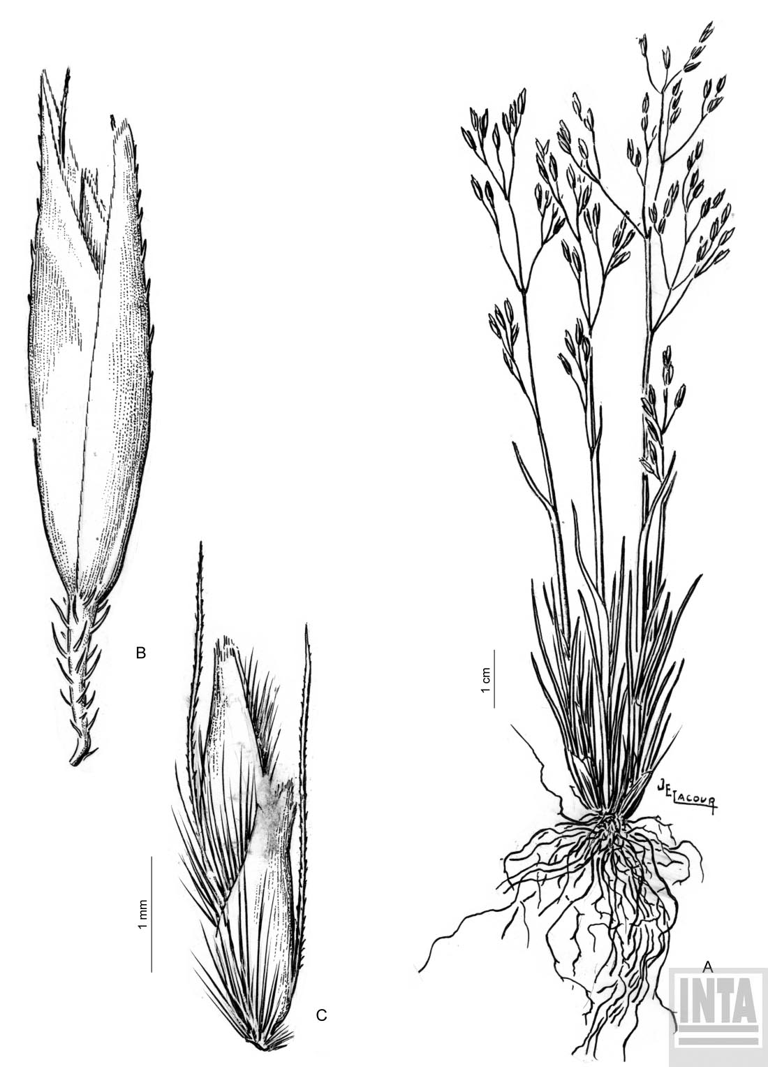 Plantas perennes, cespitosas, erectas, de 8-20 cm de alto; cañas 4-6-nodes; vainas glabras, márgenes membranosos; lígulas agudas, a veces laceradas, de 2-5 mm de largo, escariosas; láminas plegadas de 1,5-3,5 cm x 0,5-1,5 mm, cara abaxial rala a densamente escabrosa, con aguijones diminutos en los nervios. Inflorescencia en panoja abierta a ligeramente contraída, de 2,5-6 x 2-6 cm, con 4-6 verticilos, ramas capilares moderada a densamente escabrosas. Espiguillas 2-floras, violáceas, a veces mezcladas con verde; glumas subiguales, escabrosas a lo largo del nervio medio, márgenes escariosos; gluma inferior lanceolada, rara vez estrechamente lanceolada, de 2,5-6 mm de largo, 1-(3)-nervia; gluma superior lanceolada, de 2,5-7 mm de largo, 1(-3)-nervia; callo piloso, pelos alcanzando la ½ de la lemma, a veces algunos pelos superándola; lemma de 2-4 mm de largo, 4-dentada, dientes laterales más largos, rara vez todos similares, 1-4-nervia, nervios glabros; aristas débiles, curvas, retorcidas, normalmente no superando las glumas, insertas en el ? inferior o medio de la lemma, de 1,5-6 mm de largo, escabrosas, biaquilladas o planas, de 1,5-4 mm de largo, quillas escabrosas; anteras de 0,5-1 mm de largo, rojizo oscuro a violáceas; cariopsis de 0,5-1 mm de largo, ovoide.