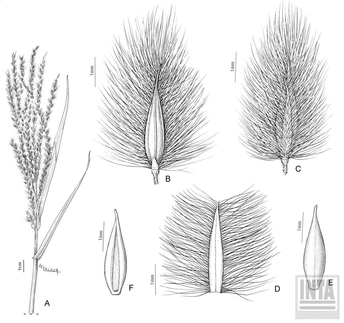 Plantas perennes de 20-80 cm de alto, cespitosas, rizomas cortos, engrosados, cubiertos de catáfilos pilosos; cañas erguidas, ramificadas; nudos glabros; lígulas de 2-3 mm de largo, triangulares, membranáceas, margen denticulado; láminas de 2-12 cm x 1,5-6 mm, planas, pilosas, con pelos de base tuberculada. Panícula de 5-19 cm de largo, paucirrámea, racimos contraídos; raquis de 0,3-0,5 mm de ancho, trígonos, escabrosos. Espiguillas de 3-4,5 x 0,75-1,5 mm, aovadas, ápice acuminado, cleistógamas y casmógamas en una misma inflorescencia, abundantemente pilosas, indumento blanco-plateado, lanoso, apareadas, pedicelos subtrígonos de 0,5 y 2 mm de largo respectivamente; gluma inferior de 0,3-0,5 mm de largo, triangular; gluma superior triangular, 2,5-4 mm de largo, 3(-5)-nervia, casi tan larga como el antecio, pilosa, en el margen, los pelos sobrepasan ampliamente su longitud; lemma inferior tan larga como la espiguilla, 3-4,5 mm de largo, 7-nervia, nervios centrales distanciados entre sí, acuminada, glabra a ambos lados del nervio medio, pilosa en los restantes espacios entre los nervios, dejando ver claramente los tres nervios centrales, pelos largos y lanosos que superan de 2,5-3 mm la longitud de la lemma; pálea inferior de 0,4-0,6 mm de largo, reducida; lodículas 1-2, reducidas; antecio superior hasta de 2,5-3,5(-4) x 1 mm, aovado, ápice acuminado, castaño a la madurez; lodículas 2, de 0,15-0,2 mm de largo, truncadas; anteras de 0,5-0,6 mm de largo; cariopsis de 1,3-2 mm de largo; hilo aovado; embrión ½ de la longitud de la cariopsis.