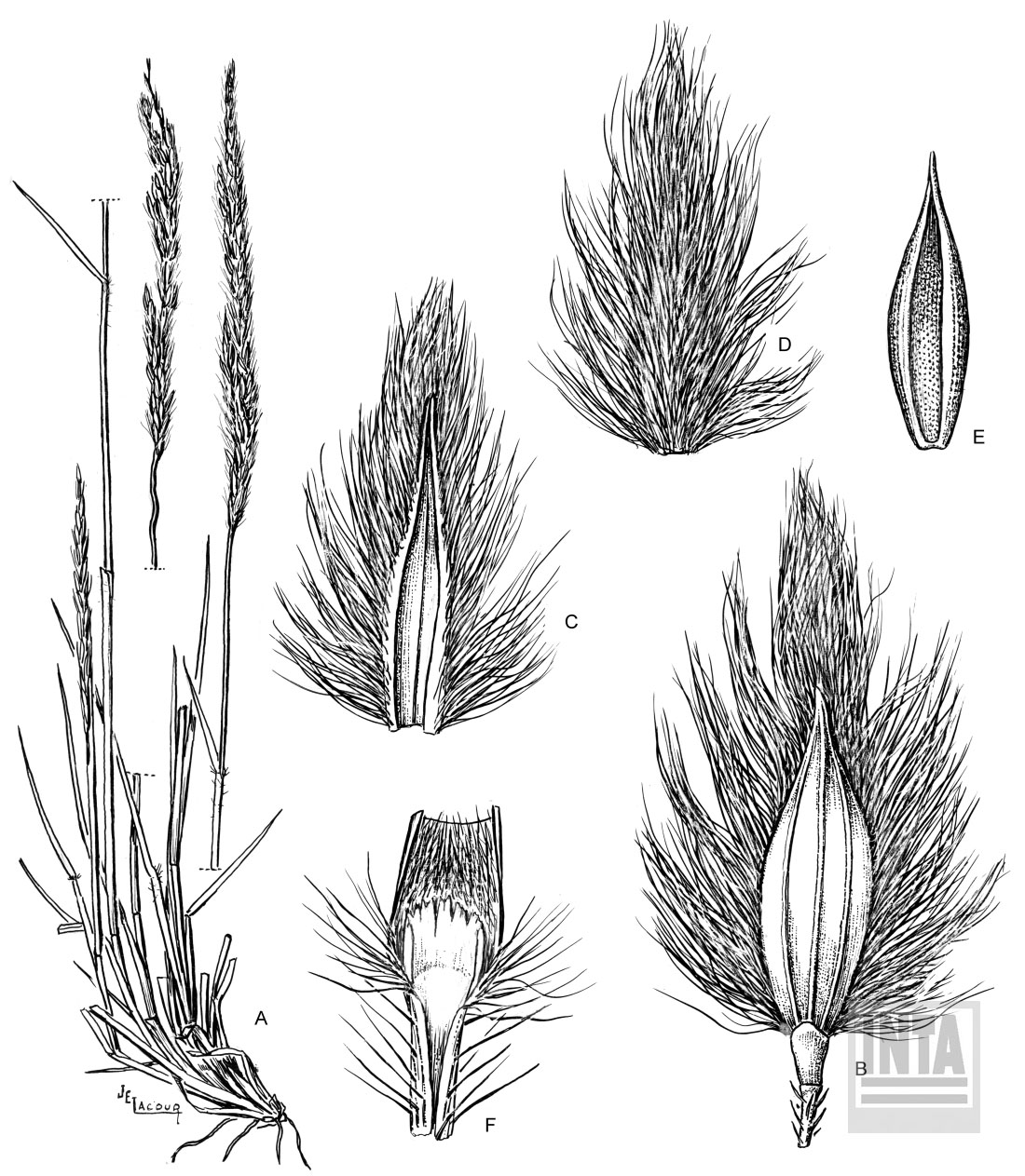 Plantas perennes de 20-80 cm de alto, cespitosas, rizomas cortos, engrosados, cubiertos de catáfilos pilosos; cañas erguidas, ramificadas; nudos glabros; lígulas de 2-3 mm de largo, triangulares, membranáceas, margen denticulado; láminas de 2-12 cm x 1,5-6 mm, planas, pilosas, con pelos de base tuberculada. Panícula de 5-19 cm de largo, paucirrámea, racimos contraídos; raquis de 0,3-0,5 mm de ancho, trígonos, escabrosos. Espiguillas de 3-4,5 x 0,75-1,5 mm, aovadas, ápice acuminado, cleistógamas y casmógamas en una misma inflorescencia, abundantemente pilosas, indumento blanco-plateado, lanoso, apareadas, pedicelos subtrígonos de 0,5 y 2 mm de largo respectivamente; gluma inferior de 0,3-0,5 mm de largo, triangular; gluma superior triangular, 2,5-4 mm de largo, 3(-5)-nervia, casi tan larga como el antecio, pilosa, en el margen, los pelos sobrepasan ampliamente su longitud; lemma inferior tan larga como la espiguilla, 3-4,5 mm de largo, 7-nervia, nervios centrales distanciados entre sí, acuminada, glabra a ambos lados del nervio medio, pilosa en los restantes espacios entre los nervios, dejando ver claramente los tres nervios centrales, pelos largos y lanosos que superan de 2,5-3 mm la longitud de la lemma; pálea inferior de 0,4-0,6 mm de largo, reducida; lodículas 1-2, reducidas; antecio superior hasta de 2,5-3,5(-4) x 1 mm, aovado, ápice acuminado, castaño a la madurez; lodículas 2, de 0,15-0,2 mm de largo, truncadas; anteras de 0,5-0,6 mm de largo; cariopsis de 1,3-2 mm de largo; hilo aovado; embrión ½ de la longitud de la cariopsis.