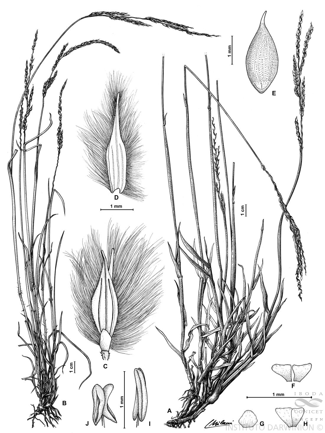 Plantas perennes de 20-80 cm de alto, cespitosas, rizomas cortos, engrosados, cubiertos de catáfilos pilosos; cañas erguidas, ramificadas; nudos glabros; lígulas de 2-3 mm de largo, triangulares, membranáceas, margen denticulado; láminas de 2-12 cm x 1,5-6 mm, planas, pilosas, con pelos de base tuberculada. Panícula de 5-19 cm de largo, paucirrámea, racimos contraídos; raquis de 0,3-0,5 mm de ancho, trígonos, escabrosos. Espiguillas de 3-4,5 x 0,75-1,5 mm, aovadas, ápice acuminado, cleistógamas y casmógamas en una misma inflorescencia, abundantemente pilosas, indumento blanco-plateado, lanoso, apareadas, pedicelos subtrígonos de 0,5 y 2 mm de largo respectivamente; gluma inferior de 0,3-0,5 mm de largo, triangular; gluma superior triangular, 2,5-4 mm de largo, 3(-5)-nervia, casi tan larga como el antecio, pilosa, en el margen, los pelos sobrepasan ampliamente su longitud; lemma inferior tan larga como la espiguilla, 3-4,5 mm de largo, 7-nervia, nervios centrales distanciados entre sí, acuminada, glabra a ambos lados del nervio medio, pilosa en los restantes espacios entre los nervios, dejando ver claramente los tres nervios centrales, pelos largos y lanosos que superan de 2,5-3 mm la longitud de la lemma; pálea inferior de 0,4-0,6 mm de largo, reducida; lodículas 1-2, reducidas; antecio superior hasta de 2,5-3,5(-4) x 1 mm, aovado, ápice acuminado, castaño a la madurez; lodículas 2, de 0,15-0,2 mm de largo, truncadas; anteras de 0,5-0,6 mm de largo; cariopsis de 1,3-2 mm de largo; hilo aovado; embrión ½ de la longitud de la cariopsis.