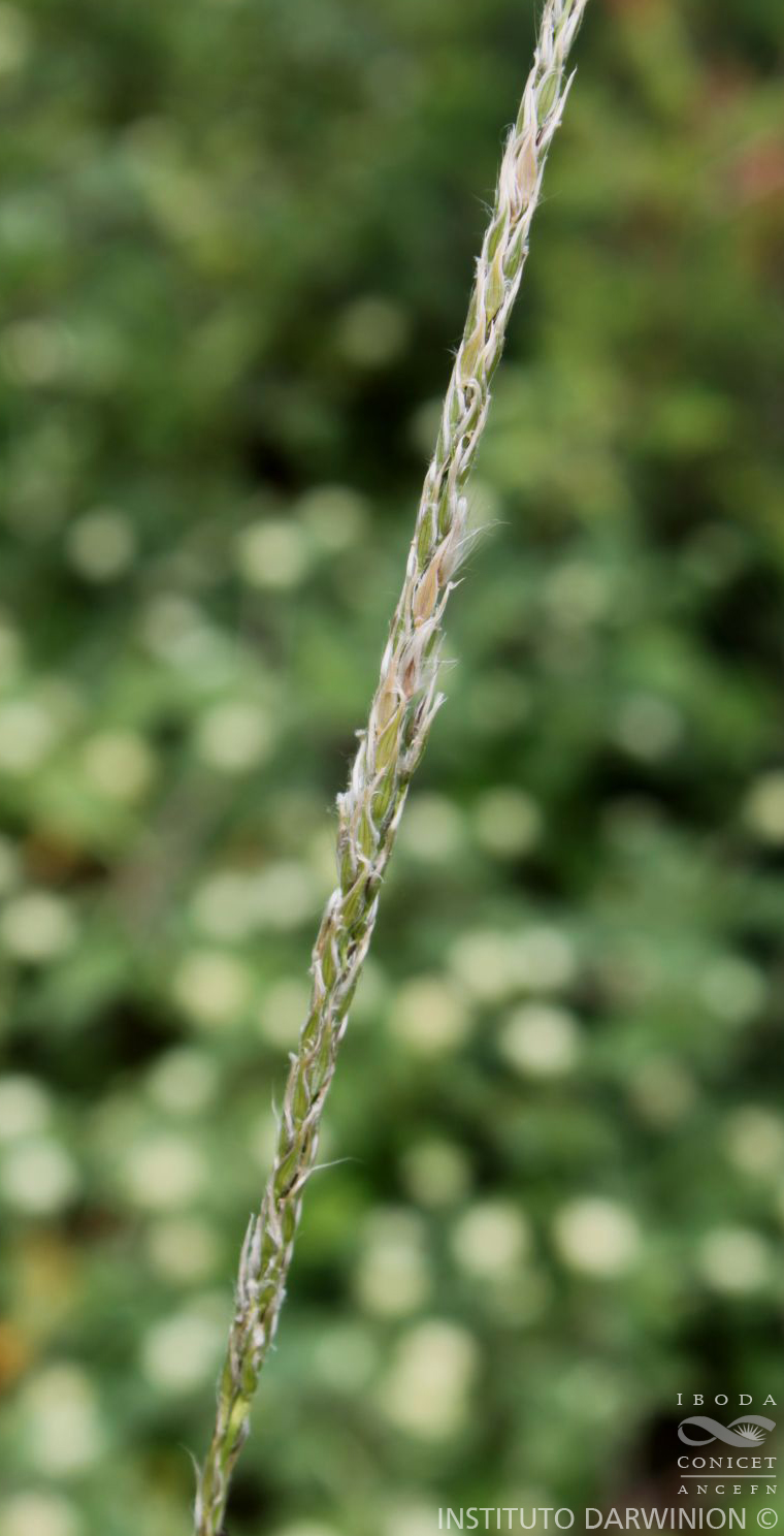 Plantas perennes, largamente rizomatosas, con rizomas vigorosos cubiertos de catáfilos seríceos; cañas de 68-100 cm de alto, erectas, plurinodes; nudos castaños, glabros; vainas inferiores a menudo pubescentes en la base, estriadas, glabras; láminas de 7-23 cm x 3-6 mm, linear-lanceoladas, planas, glabras; lígulas de 1-2,5 mm de largo, subtriangulares, ápice obtuso, margen denticulado. Panícula contraída de 20-27 cm de largo, con 7-9 racimos alternos sobre un eje cuadrangular y escabroso, racimos basales más largos y más distanciados entre sí que los apicales; raquis de 0,5 mm de ancho, escabroso; pedicelos de 1-6,5 mm de largo, subtrígonos, escabrosos. Espiguillas de 6,3-6,6 x 1,2-1,4 mm, en grupos de 2, castañas, fácilmente caducas, casmógamas y cleistógamas en un mismo racimo, pilosas, indumento formado por pelos ocráceos; gluma inferior de 0,6-0,7(-2) mm de largo, membranácea, ápice obtuso, con margen hialino breve; gluma superior de 5,5-5,7 mm de largo, 3-nervia, acuminada, pilosa en zonas internerviales y marginales; lemma inferior tan larga como la espiguilla, (5-)7-nervia, acuminada, terminando en una seudoarista ca. 2 mm de largo, nervio medio distante de los laterales contiguos; pálea inferior de 0,4 mm de largo, reducida, membranácea; antecio superior de 5-5,5 mm de largo, acuminado, cartilaginoso con márgenes membranáceos, castaño-negruzco; pálea superior de 4,2-4,3 mm de largo, 2-nervia; lodículas 2, de 0,4-0,5 mm de largo; estambres 3, anteras de 1,3-1,4 mm de largo; estigmas plumosos, pálidos; cariopsis de 2,3-2,6 mm de largo, oblongo; embrión menos de ½ de la longitud de la cariopsis; hilo oblongo, castaño oscuro.