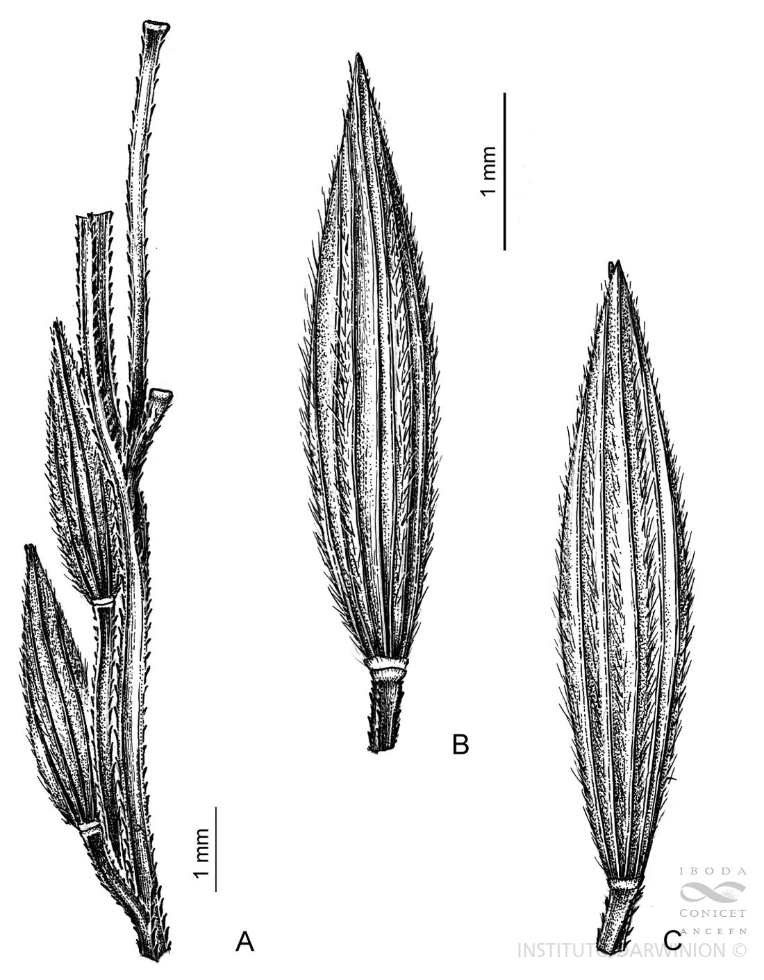 A, fragmento del raquis con un par de espiguillas; B, espiguilla vista por el lado de la gluma inferior y lemma inferior; C, espiguilla vista del lado de la gluma superior.