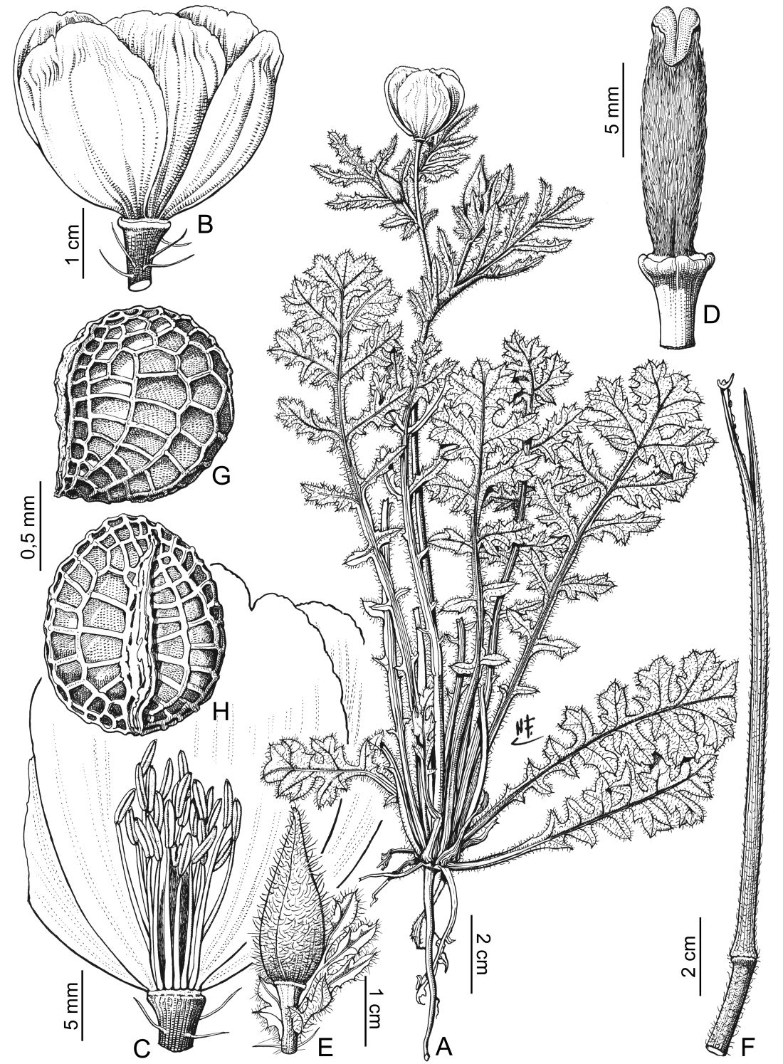 Hierba anual, raramente bienal, hasta de 50 cm de alto, con un denso indumento de tricomas pluricelulares simples; tallos ramificados. Hojas basales pinnatisectas, hasta de 20 cm de largo; las caulinares semiamplexicaules; láminas pinnatilobadas, lóbulos dentado-mucronados. Flores con pedúnculos hasta de 5 cm de largo; sépalos de 15-30 mm de largo, vilosos; pétalos obovados, de 1,5-3 cm de largo, anaranjados a rojos, con una mancha basal oscura; estambres numerosos, filamentos amarillos, desiguales, anteras oscuras; ovario con abundantes tricomas adpresos; estigma 2-lobado, con lóbulos reniformes. Fruto una cápsula silicuiforme, linear, hasta de 25 cm de largo, recta o levemente falcada, pubescente, coronada por el estigma persistente. Semillas negruzcas.