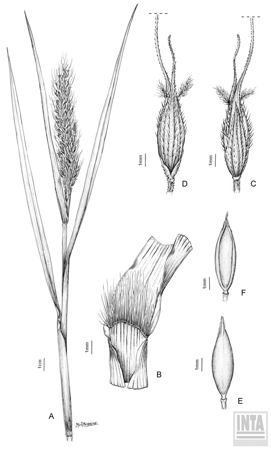 Planta perenne, rizomatosa, con cañas de 0,30-1,30 m de alto, decumbentes en la base, luego erguidas; entrenudos huecos, glabros, nudos hirsutos; vainas estriadas, glabras, usualmente más cortas que los entrenudos; lígulas de 1-3,7 mm de largo, ciliadas, ocasionalmente ausentes; láminas linear-lanceoladas, de 7-30 x 0,5-1,2 cm, planas, glabras, los márgenes escabrosos. Inflorescencias contraidas, exertas, de 5-22 x 1-2 cm, erectas a nutantes; eje principal escabroso, anguloso, pulvínulos pilosos; ramificaciones adpresas al eje principal, alternas, eje de las ramificaciones escabrosos, angulosos, pedicelos de 1-6 mm de largo, apareados. Espiguillas elipsoides, de 5,8-7 x 1,6-2,1 mm, escabrosas a cortamente equinuladas; gluma inferior de 4,4-5 mm de largo, (5-)7-nervia, los nervios escabrosos; gluma superior de 5,9-6,1 mm de largo, 9-nervia, escabrosa y con una arista corta, de 2-6,5 mm de largo; lemma inferior glumiforme, con arista de 5-14,5 mm de largo; pálea inferior lanceolada, membranácea, ligeramente mayor que el antecio superior, 2-nervia, los nervios escabrosos; flor inferior estaminada, estambres 3, anteras de 3,5-4 mm de largo; antecio superior elipsoide, de 5-6 x 1,5-1,8 mm, endurecido, liso, cortamente piloso hacia el ápice; cariopsis anchamente ovoide, de 2,5 x 1,4-1,6 mm; hilo punctiforme, embrión ½ del largo de la cariopsis.