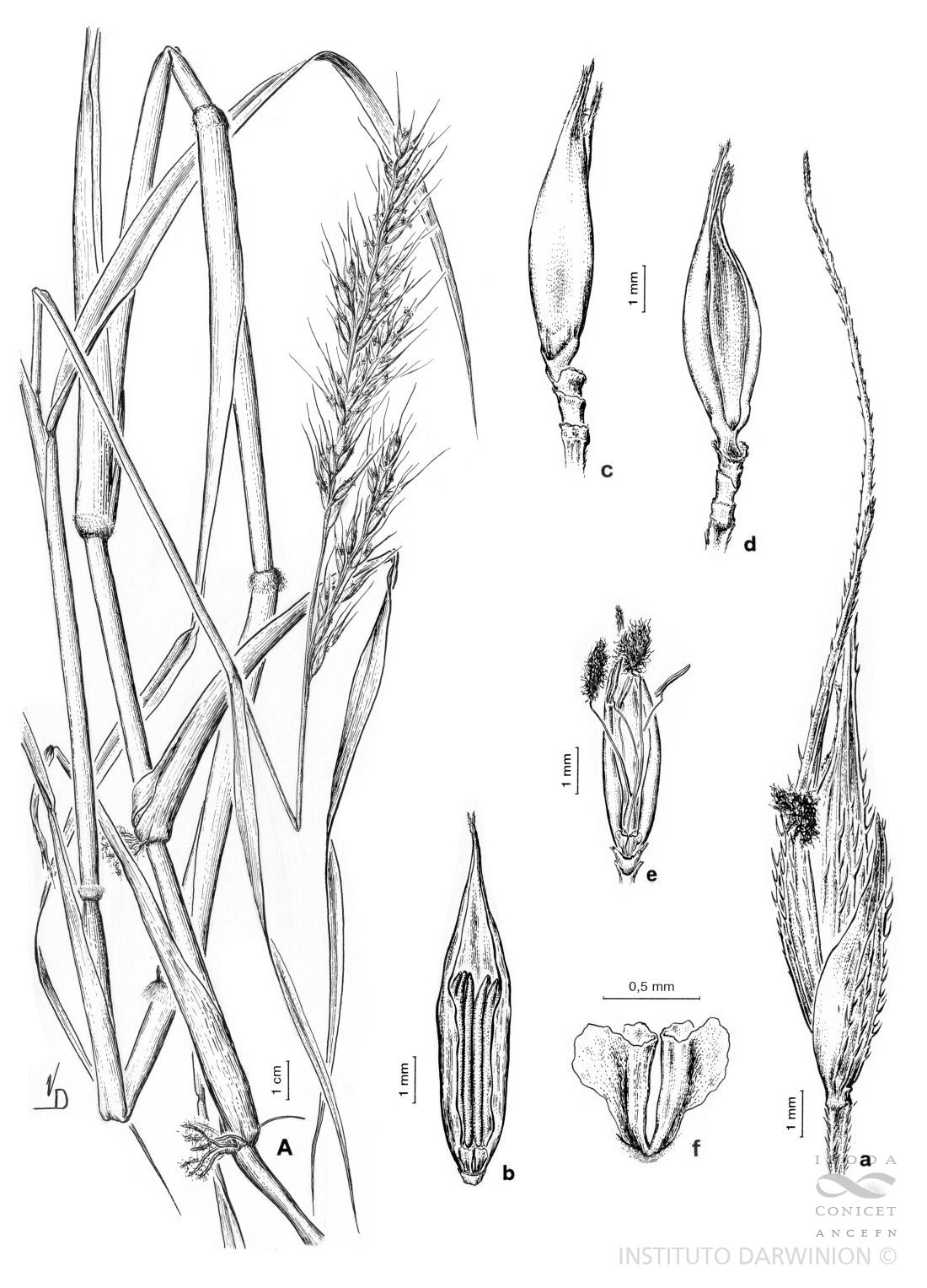 Planta perenne, rizomatosa, con cañas de 0,30-1,30 m de alto, decumbentes en la base, luego erguidas; entrenudos huecos, glabros, nudos hirsutos; vainas estriadas, glabras, usualmente más cortas que los entrenudos; lígulas de 1-3,7 mm de largo, ciliadas, ocasionalmente ausentes; láminas linear-lanceoladas, de 7-30 x 0,5-1,2 cm, planas, glabras, los márgenes escabrosos. Inflorescencias contraidas, exertas, de 5-22 x 1-2 cm, erectas a nutantes; eje principal escabroso, anguloso, pulvínulos pilosos; ramificaciones adpresas al eje principal, alternas, eje de las ramificaciones escabrosos, angulosos, pedicelos de 1-6 mm de largo, apareados. Espiguillas elipsoides, de 5,8-7 x 1,6-2,1 mm, escabrosas a cortamente equinuladas; gluma inferior de 4,4-5 mm de largo, (5-)7-nervia, los nervios escabrosos; gluma superior de 5,9-6,1 mm de largo, 9-nervia, escabrosa y con una arista corta, de 2-6,5 mm de largo; lemma inferior glumiforme, con arista de 5-14,5 mm de largo; pálea inferior lanceolada, membranácea, ligeramente mayor que el antecio superior, 2-nervia, los nervios escabrosos; flor inferior estaminada, estambres 3, anteras de 3,5-4 mm de largo; antecio superior elipsoide, de 5-6 x 1,5-1,8 mm, endurecido, liso, cortamente piloso hacia el ápice; cariopsis anchamente ovoide, de 2,5 x 1,4-1,6 mm; hilo punctiforme, embrión ½ del largo de la cariopsis.
