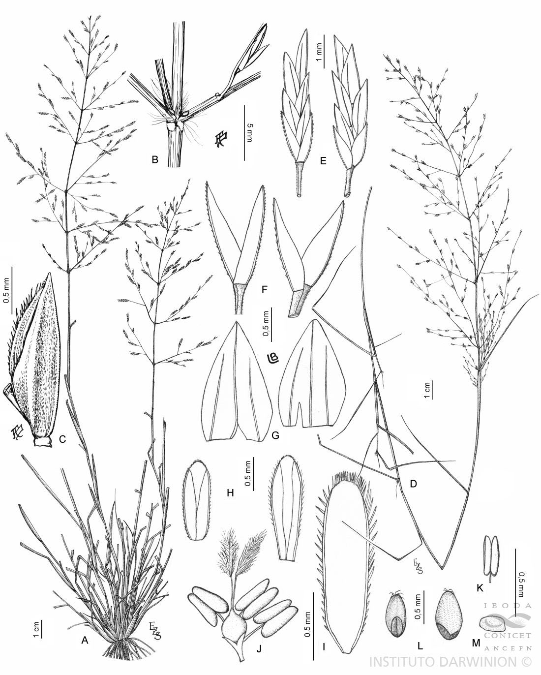 Plantas perennes, cespitosas, nudosas cerca de la base con innovaciones extravaginales; cañas de 35-70 cm de alto, erectas, glabras proximalmente, usualmente con un anillo de glándulas punctiformes debajo de los nudos, 2-5-nodes; vainas ? del largo de los entrenudos superiores, ciliadas en su porción distal, los tricomas de base papilosa y hasta de 6 mm de largo; lígulas de 0,5-0,6 mm de largo, ciliadas; láminas de (3-)4-15 cm x 1,5-4(-5) mm, planas a involutas, rígidamente divergentes, divaricadas, glabras adaxialmente, con largos y densos tricomas cerca de la lígula, los tricomas de 3-6 mm de largo, algo víscidas en la cara adaxial. Inflorescencias de (6-)10-30(-40) x (3-)6-15(-18) cm, oblongas, abiertas; ramificaciones primarias generalmente de 4-11 cm de largo, divergentes en ángulos de 30º-80° con relación al raquis, verticiladas, con espacios vacíos a lo largo del pedúnculo entre cada verticilo, cada nudo del pedúnculo principal densamente piloso y glandular; pulvínulos esparcidamente pilosos, algunas veces glandulares; pedicelos de 0,2-1,5 mm de largo, más cortos que las espiguillas (excepto para la espiguilla terminal), adpresos a lo largo del eje de las ramificaciones, escabriúsculos. Espiguillas de 3,5-6,5 x 1-1,5 mm, 4-10(-13)-floras, ovoides a lanceoladas, rojizo-purpúreas a estramíneas; raquilla que se desarticula; glumas de 0,8-2 mm de largo, subiguales, linear-lanceoladas, membranáceas, escabriúsculas cerca del ápice; gluma inferior de 0,8-1,5 (-1,8) mm de largo, más estrecha que la gluma superior; gluma superior de 1,2-2 mm de largo; lemma de 1,6-2,2 mm de largo, ovada a lanceolada, membranácea a cartácea, nervios laterales evidentes, frecuentemente verdosos, escabriúscula a lo largo de las carinas, ápice agudo; pálea de 1,4-2 mm de largo, más corta que la lemma, cartácea, ápice obtuso; estambres 3, anteras de 0,1-0,3 mm de largo, rojizo-castañas; cariopsis de 0,4-0,8 mm de largo, ovoidea, redondeada en corte transversal, lisa, sin surco ventral, castaña muy clara, translúcida.