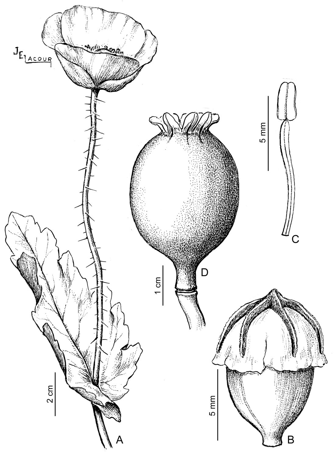 Hierba anual, hasta de 1 m de alto, robusta, glauca, generalmente glabra, con látex blanco; tallo erguido, generalmente simple. Hojas glabras, las inferiores con láminas de contorno ovado-oblongo, de 2-30 × 1,5-20 cm, cordado-amplexicaules, agudas, el margen ondulado, aserrado o dentado, pecioladas; las superiores sésiles, gradualmente de menor tamaño que las basales. Flores de 5-10 cm de diámetro; pedúnculo de 10-20 cm de largo; sépalos ovados, muy cóncavos, algo cuculados; pétalos anchamente obovados, de 2-4,5 cm de largo, blancos, rosados o rojos, raramente purpúreos, con o sin una mácula oscura en la base, y con el margen algo ondulado; filamentos estaminales amarillentos. Fruto una cápsula subglobosa, de 3-5 cm de largo, sésil o subestipitada, lisa, glabra; disco estigmático plano, más angosto que el ancho de la cápsula, con 8-12 crestas. Semillas grisáceas a negras, reticuladas.