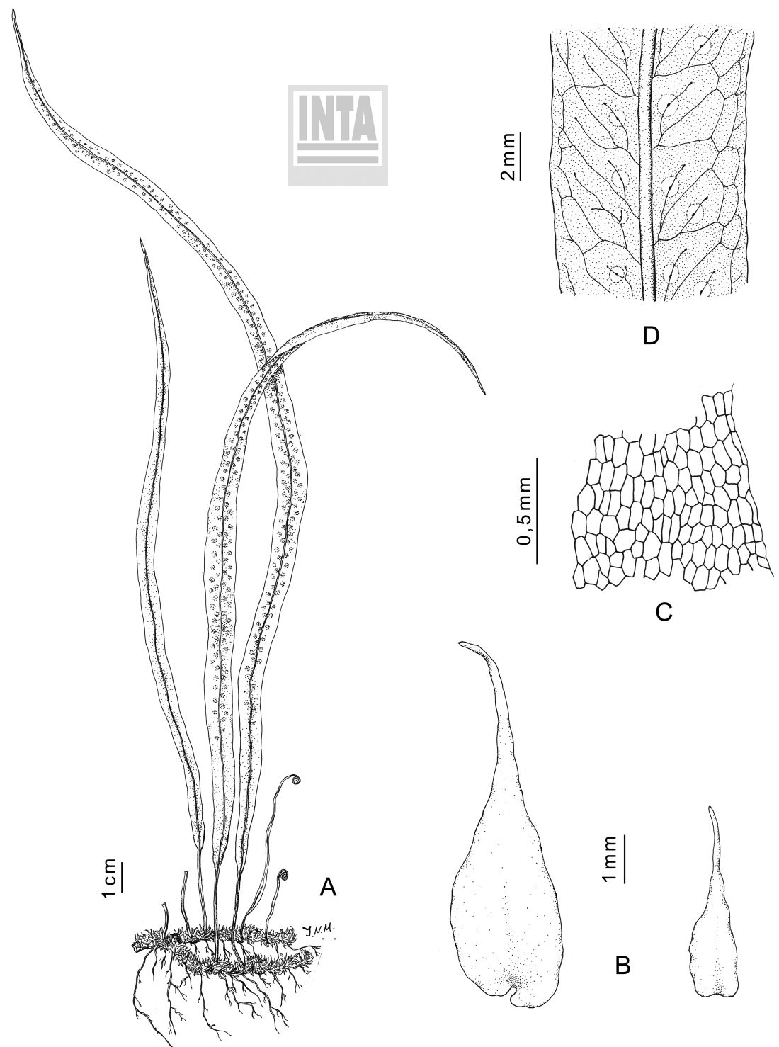 A. Planta. B. Escamas rizomáticas. C. Estructura central y marginal de escama rizomática. D. Detalle de una fronde fértil, cara abaxial, mostrando la venación y posición de los soros.