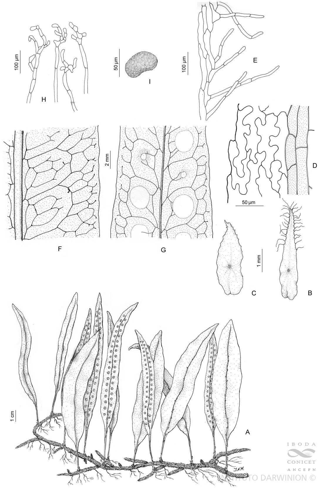 Epífitas, raro saxícolas. Rizomas largamente rastreros, ramificados, aplanados dorsiventralmente, de 3-7 mm de diámetro; con escamas adpresas, basipeltadas, ovadodeltoideas, de 3-4 mm de largo, base redondeada castaño rojiza, margen fuertemente ciliado, incoloro, con células poligonales alargadas, las marginales de paredes onduladas. Frondes hemidimorfas, las fértiles más cortas y angostas que las estériles; pecíolos inconspicuos hasta ¼ de la longitud de la fronde, alados, articulados al rizoma, con escamas basipeltadas, de 1-1,2 mm de largo, delicadas, caducas; láminas enteras, las estériles lanceoladas, de 15-25 × 2-2,5 cm, base atenuada, ápice atenuado a redondeado; las fértiles linear-elípticas a linearoblongas, de 10-15 × 1-1,5 cm, base largamente atenuada, ápice redondeado, coriáceas, glabras, costa con escamas similares a las peciolares; venación anastomosada, con aréolas mayores libres o anastomosadas, con numerosas venillas inclusas, simples o ramificadas, y aréolas menores costales y marginales, aréolas fértiles con 1-3 venillas, aréolas marginales pequeñas sin venillas incluidas o venillas libres sin formar aréolas. Soros circulares, globosos, de 2-3 mm de diámetro, generalmente pleosoros a dictiosoros, raramente los soros son polipodioides; parafisos filamentosos, cortos, ramificados. Esporas reticulado-verrugosas de 50-70 µm de diámetro ecuatorial.