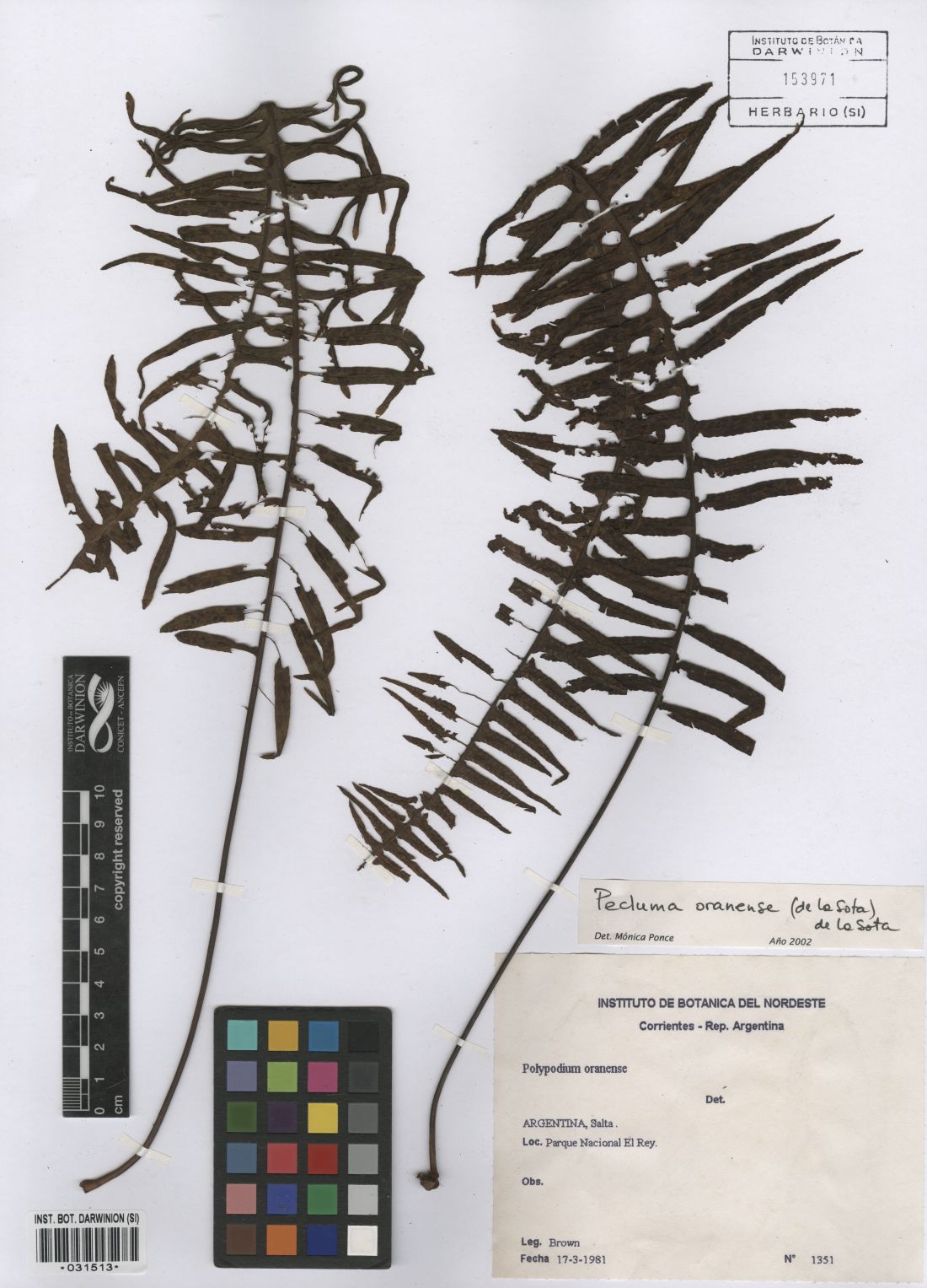 Plantas epífitas. Rizomas cortos, rastreros, de 5-9 mm de diámetro, con escamas basifijas, ovado-deltoideas, de 2-3 mm de largo, ápice acuminado, margen dentado, densamente comosas, ocasionalmente ocultas por los tricomas, castañas a oscuras, con retículo celular poco visible, quebradizas, subclatradas a no clatradas. Frondes de 50-70 cm de largo; pecíolos 10(-20) cm de largo, castaños a oscuros, glabrescentes, con escasos tricomas catenados, raro ctenoides, amarillos a castaños; filopodios de 1,5-2 mm de largo; láminas oblongolanceoladas, de 40-60 × 10-13 cm, de base truncada y ápice gradualmente atenuado, pinnatisectas; raquis oscuros, en línea recta, pubescentes, con tricomas catenados y ctenoides; pinnas 70-80 pares, perpendiculares al raquis, oblongo-lineares a linear-lanceoladas, de 50-65 × 5-7 mm, de base simétrica, ensanchada y ápice atenuado, margen entero a crenado, pinnas basales no reducidas a aurículas herbáceas, cara adaxial con tricomas claviformes esparcidos y aciculares sobre el margen, cara abaxial con tricomas aciculares sobre costas y margen; venación libre, 1(-2) furcada. Soros de 5-8 mm de diametro, medianos, con parafisos simples. Esporangios glabros. Esporas verrugadas, de 48-50 µm de diámetro ecuatorial.